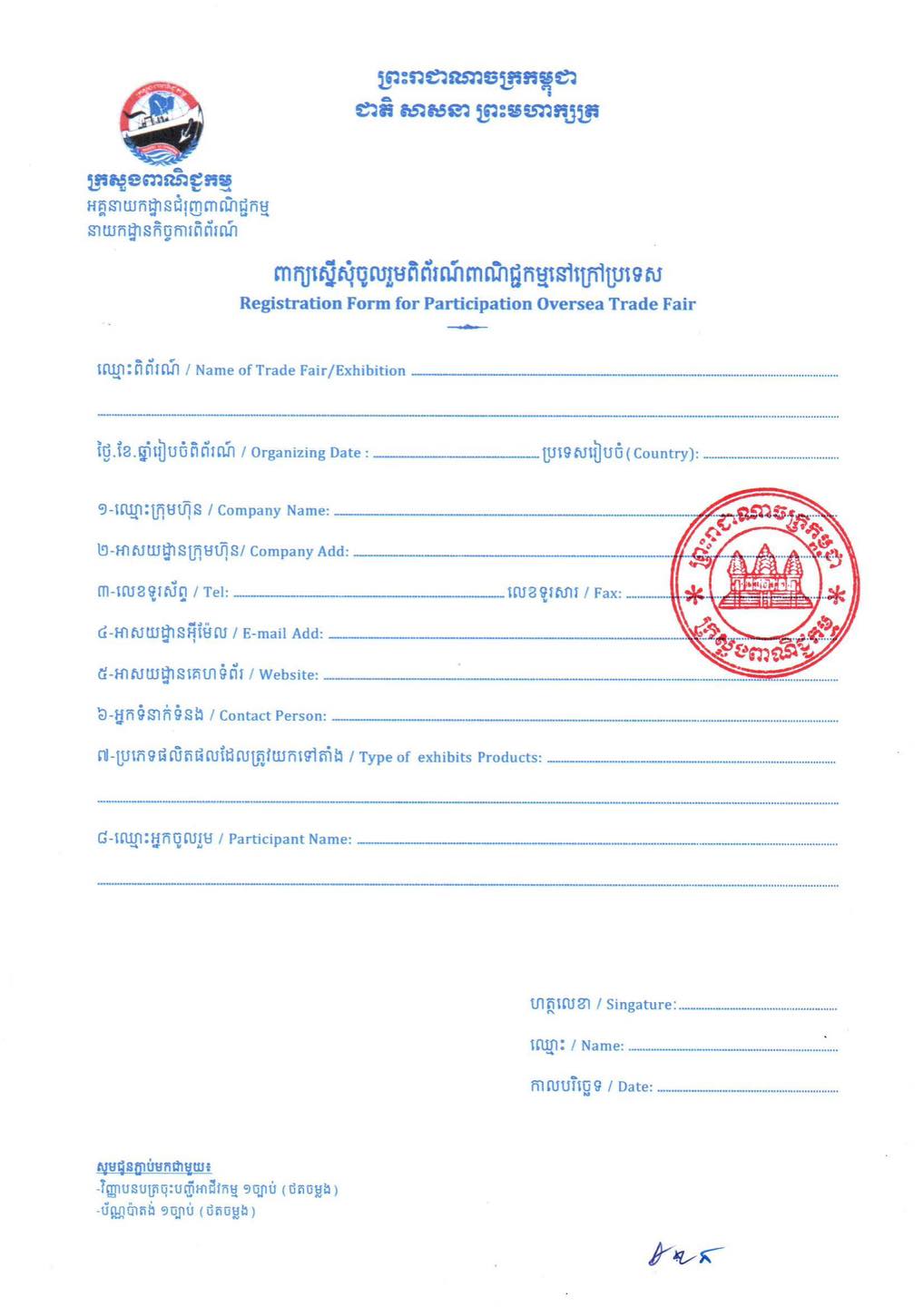 សម្រាប់ព័ត៌មានបន្ថែម សូមទាក់ទងមកនាយកដ្ឋានកិច្ចការពិព័រណ៍ អគ្គនាយកដ្ឋានជំរុញ ពាណិជ្ជកម្ម នៃក្រសួងពាណិជ្ជកម្ម តាមរយៈអាសយដ្ឋាន៖ ដីឡូត៍លេខ១៩-៦១ មហាវិថីសហព័ន្ធរុស្ស៊ី ភូមិទឹកថ្លា សង្កាត់ទឹកថ្លា ខណ្ឌសែនសុខ រាជធានីភ្នំពេញ