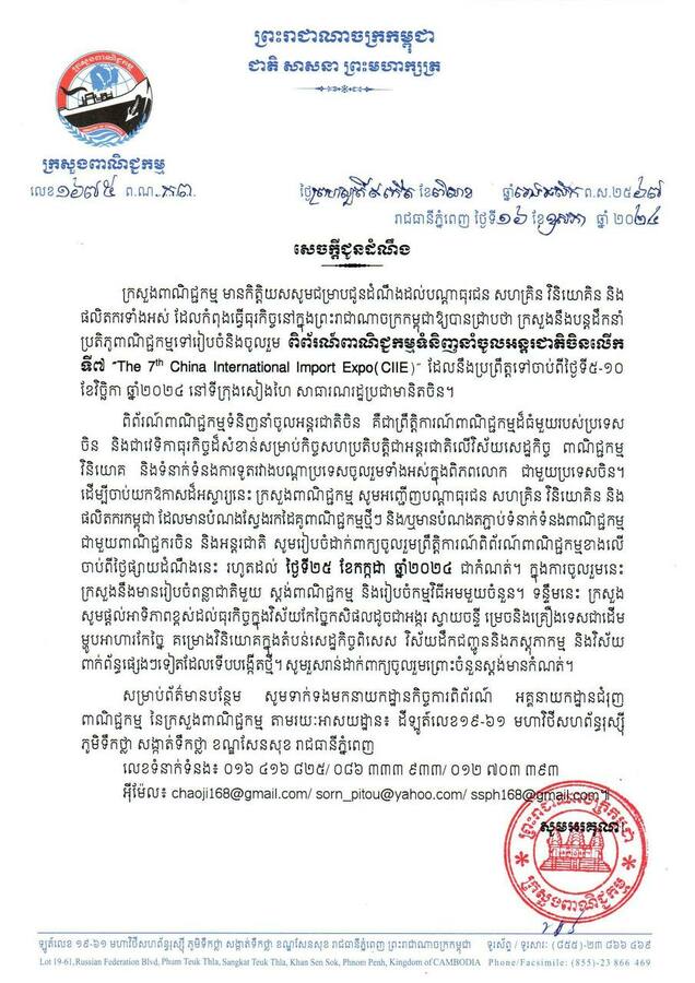 តាមរយៈសេចក្ដីជូនដំណឹងដែលចេញផ្សាយនៅថ្ងៃទី២០ ខែឧសភា ឆ្នាំ២០២៤នេះ ក្រសួងពាណិជ្ជកម្ម បានជូនដំណឹងដល់បណ្តាធុរជន សហគ្រិន វិនិយោគិន និង ផលិតករទាំងអស់ ដែលកំពុងធ្វើធុរកិច្ចនៅក្នុងព្រះរាជាណាចក្រកម្ពុជាឱ្យបានជ្រាបថា ក្រសួងនឹងបន្តដឹកនាំ ប្រតិភូពាណិជ្ជកម្មទៅរៀបចំនិងចូលរួម ពិព័រណ៍ពាណិជ្ជកម្មទំនិញនាំចូលអន្តរជាតិចិនលើក ទី៧ “The 7th China International Import Expo(CIIE) ដែលនឹងប្រព្រឹត្តទៅចាប់ពីថ្ងៃទី៥-១០ ខែវិច្ឆិកា ឆ្នាំ២០២៤ នៅទីក្រុងសៀងហៃ សាធារណរដ្ឋប្រជាមានិតចិន។