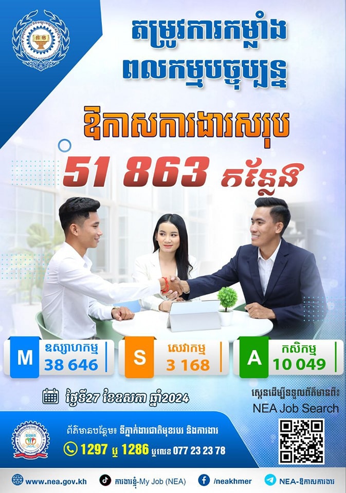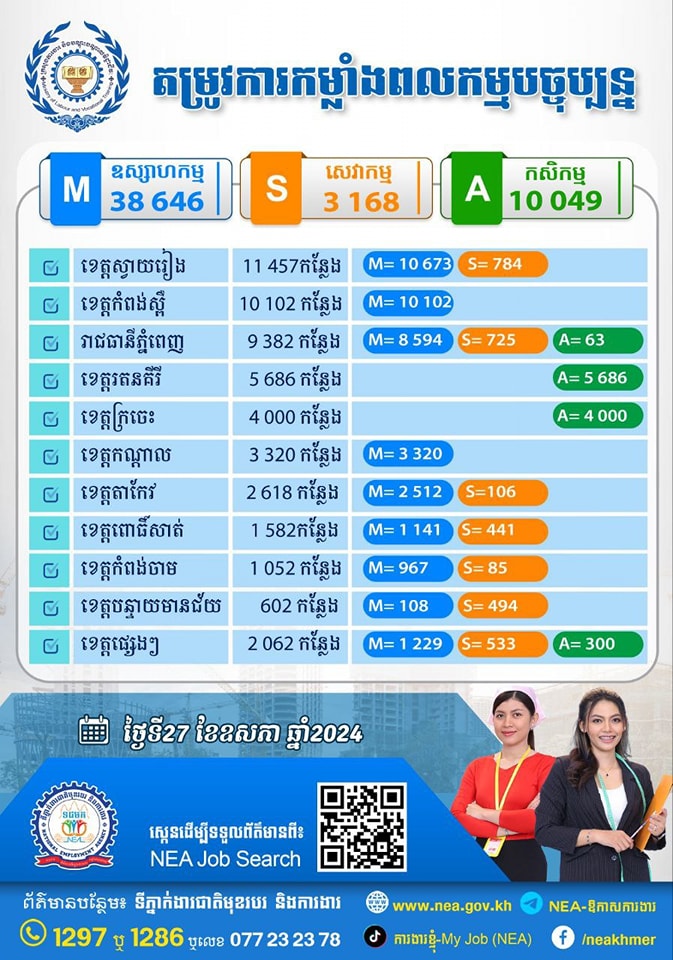 យោងតាមការចុះផ្សាយរបស់ក្រសួងការងារ និងបណ្ដុះបណ្ដាលវិជ្ជាជីវៈ កាលពីថ្ងៃចន្ទ ទី២៧ ខែឧសភា ឆ្នាំ២០២៤ បានឱ្យដឹងថា តម្រូវការកម្លាំងពលកម្មបច្ចុប្បន្នមានចំនួន ៥១ ៨៦៣កន្លែង នៅតាមបណ្ដារាជធានី-ខេត្ត ក្នុងនោះផ្នែកកឧស្សាហកម្ម ៣៨៦៤៦ ផ្នែកសេវាកម្ម ៣១៦៨ និងផ្នែកកសិកម្ម ១០ ០៤៩។