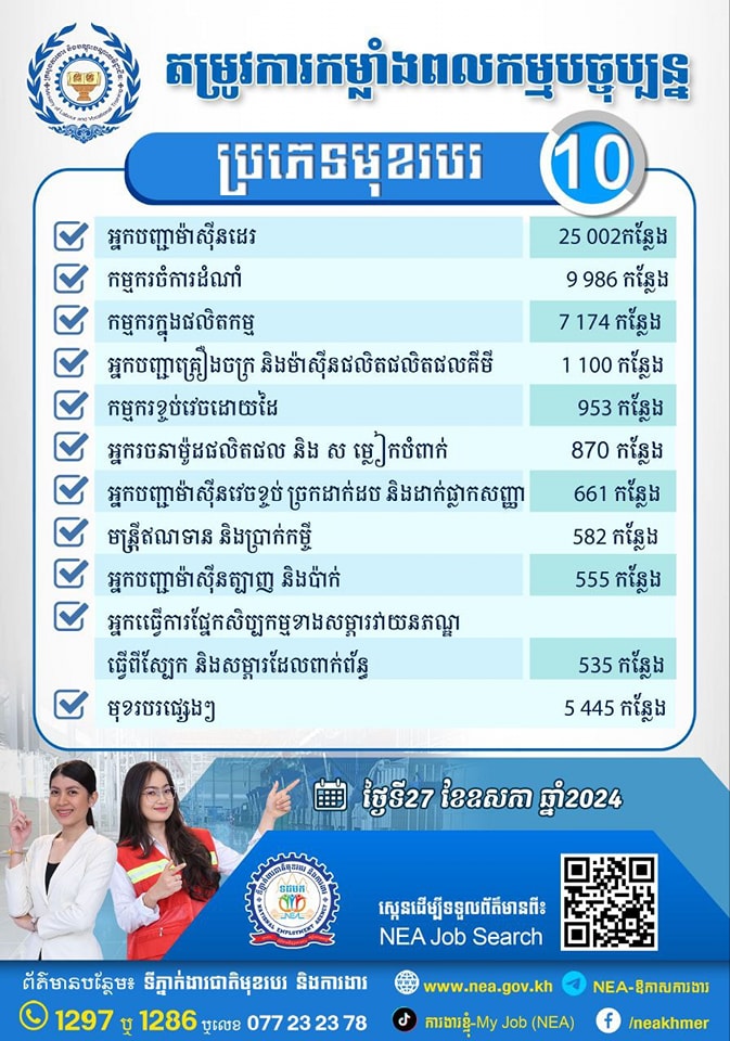 ក្រសួងការងារ ក៏បានបញ្ជាក់ថា ប្រភេទមុខរបរដែលកំពុងត្រូវការកម្លាំងពលកម្ម អ្នកបញ្ជាម៉ាស៊ីនដេរ កម្មករចំការដំណាំ កម្មករផលិតកម្ម អ្នកបញ្ជាគ្រឿងចក្រ និងម៉ាស៊ីនផលិតផលិតផលគីមី កម្មករខ្ចប់វេចដោយដៃ អ្នករចនាម៉ូដផលិតផល និងសម្លៀកបំពាក់ អ្នកបញ្ជាម៉ាស៊ីនវេចខ្ចប់ ច្រកដាក់ដប និងដាក់ផ្លាកសញ្ញា មន្រ្តីឥណទាន និងប្រាក់កម្ចី អ្នកបញ្ជាម៉ាស៊ីនត្បាញ និងប៉ាក់ អ្នកធ្វើការផ្នែកសិប្បកម្មខាងសម្ភារវាយនភណ្ឌ ធ្វើពីស្បែក និងសម្ភារដែលពាក់ព័ន្ធ និងមុខរបរផ្សេងៗ។