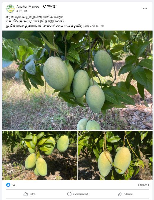 ជាដំណឹងដ៏ល្អមួយសំរាប់បងប្អូនកសិករដែលប្រកបរបរដាំស្វាយ ខណៈក្រុមហ៊ុន អង្គរហ្គ្រីន (Angkor Green) បានប្រកាសថា ត្រូវការទិញស្វាយខៀវ ចំនួន ៥០តោន។ នេះបើយោងតាមការបង្ហោះរបស់ក្រុមហ៊ុននៅលើផេកផ្លូវឈ្មោះថា Angkor Mango – ស្វាយអង្គរ