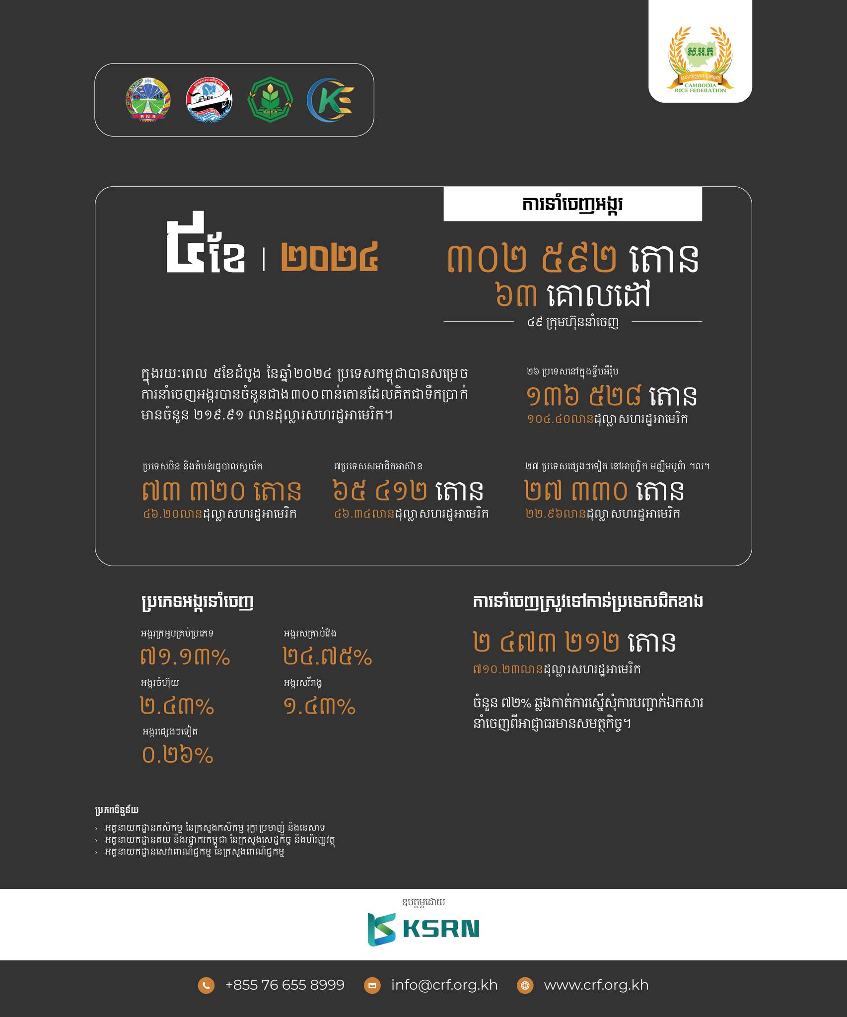 ក្នុងរយៈពេល ៥ខែដំបូងនៃឆ្នាំ២០២៤ ប្រទេសកម្ពុជារកចំណូលបានជិត ១ពាន់លានដុល្លារ ពីការនាំចេញស្រូវចំនួន ២,៤៧៣,២១២តោននិងអង្ករចំនួន ៣០២ ៥៩២ តោន។ នេះបើយោងតាមរបាយការណ៍ដែលចេញផ្សាយដោយ សហព័ន្ធស្រូវអង្ករកម្ពុជា នាថ្ងៃ០៦ ខែមិថុនា ឆ្នាំ២០២៤។