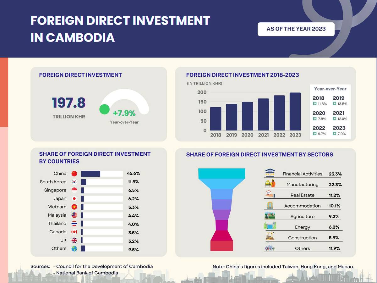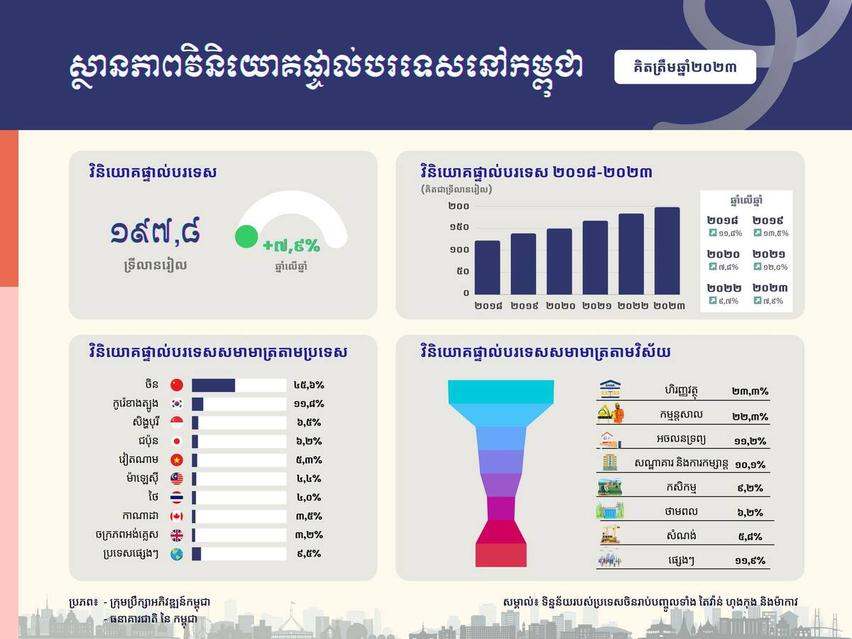 ក្រសួងព័ត៌មាន នាថ្ងៃទី១៩ ខែមិថុនា ឆ្នាំ២០២៤ នេះ បានចុះផ្សាយថា តាមប្រភពព័ត៌មាន ពីធនាគារជាតិ នៃកម្ពុជា នាព្រឹកថ្ងៃទី១៨ ខែមិថុនា ឆ្នាំ២០២៤នេះ បានឱ្យដឹងថា គិតត្រឹមឆ្នាំ២០២៣ វិនិយោគផ្ទាល់បរទេសនៅកម្ពុជាមាន ១៩៧,៨ ទ្រីលានរៀល ដែលសមមូលជាប្រាក់ដុល្លារចំនួន ៤៨,៤ ប៊ីលានដុល្លារអាមេរិក។ ចំនួននេះ កើនឡើង ៧,៩% ធៀបនឹងឆ្នាំ២០២២។