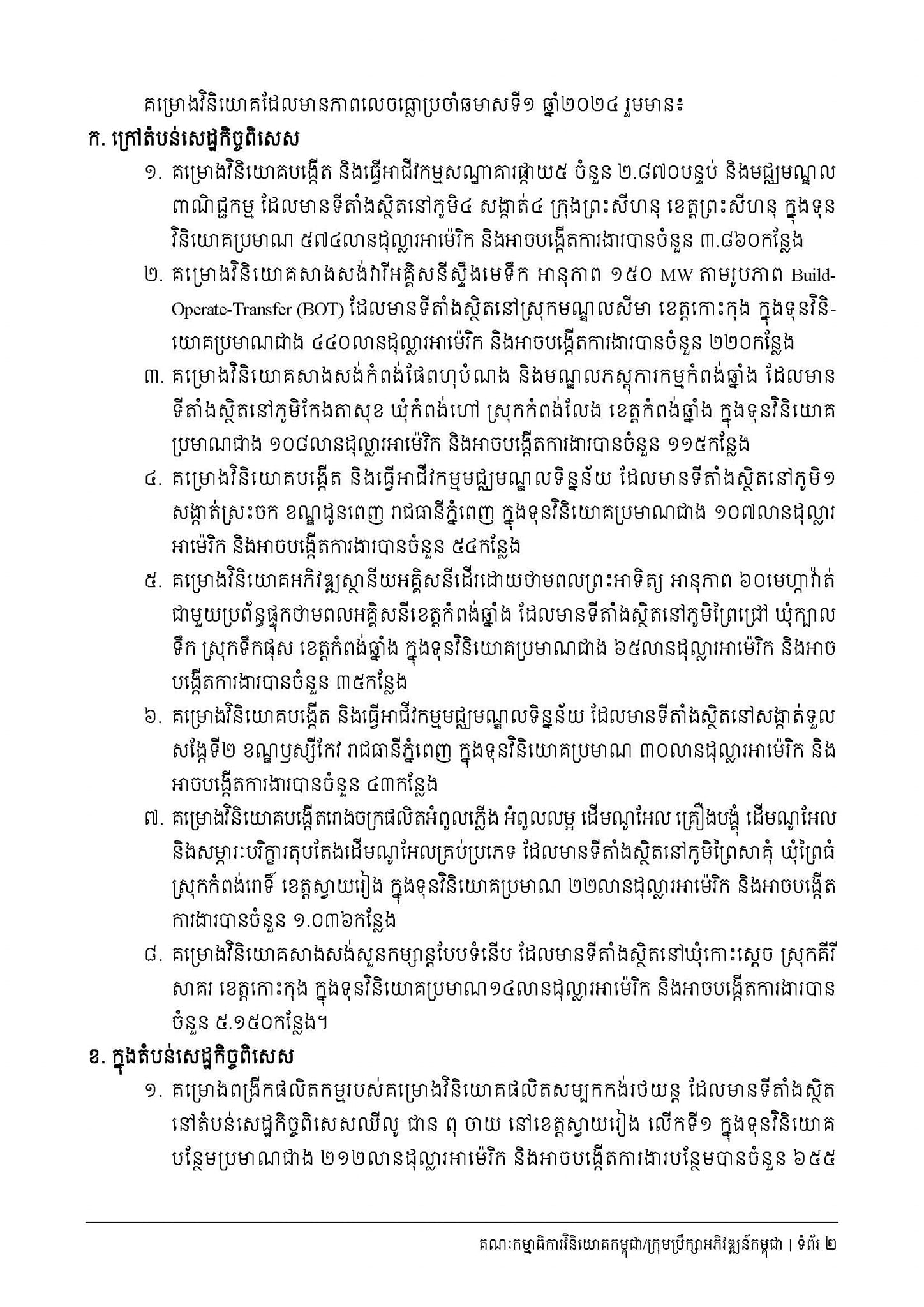 យោងតាមការចុះផ្សាយរបស់ ក្រុមប្រឹក្សាអភិវឌ្ឍន៍កម្ពុជា ហៅកាត់ថា (CDC) បានឱ្យដឹងថា គិតចាប់ពីខែមករា រហូតដល់ខែមិថុនា ឆ្នាំ២០២៤ ក្រុមប្រឹក្សាអភិវឌ្ឍន៍កម្ពុជាបានអនុម័តគម្រោងថ្មី, គម្រោងពង្រីកផលិតកម្ម, និងគម្រោងវិនិយោគបង្កើតតំបន់សេដ្ឋកិច្ចពិសេសសរុបចំនួន ១៩០គម្រោង ដែលមានទុនវិនិយោគសរុបប្រមាណ ៣,២ពាន់លានដុល្លារអាមេរិក និងអាចបង្កើតការងារបានចំនួន ១៦៨.៥៧២កន្លែង។