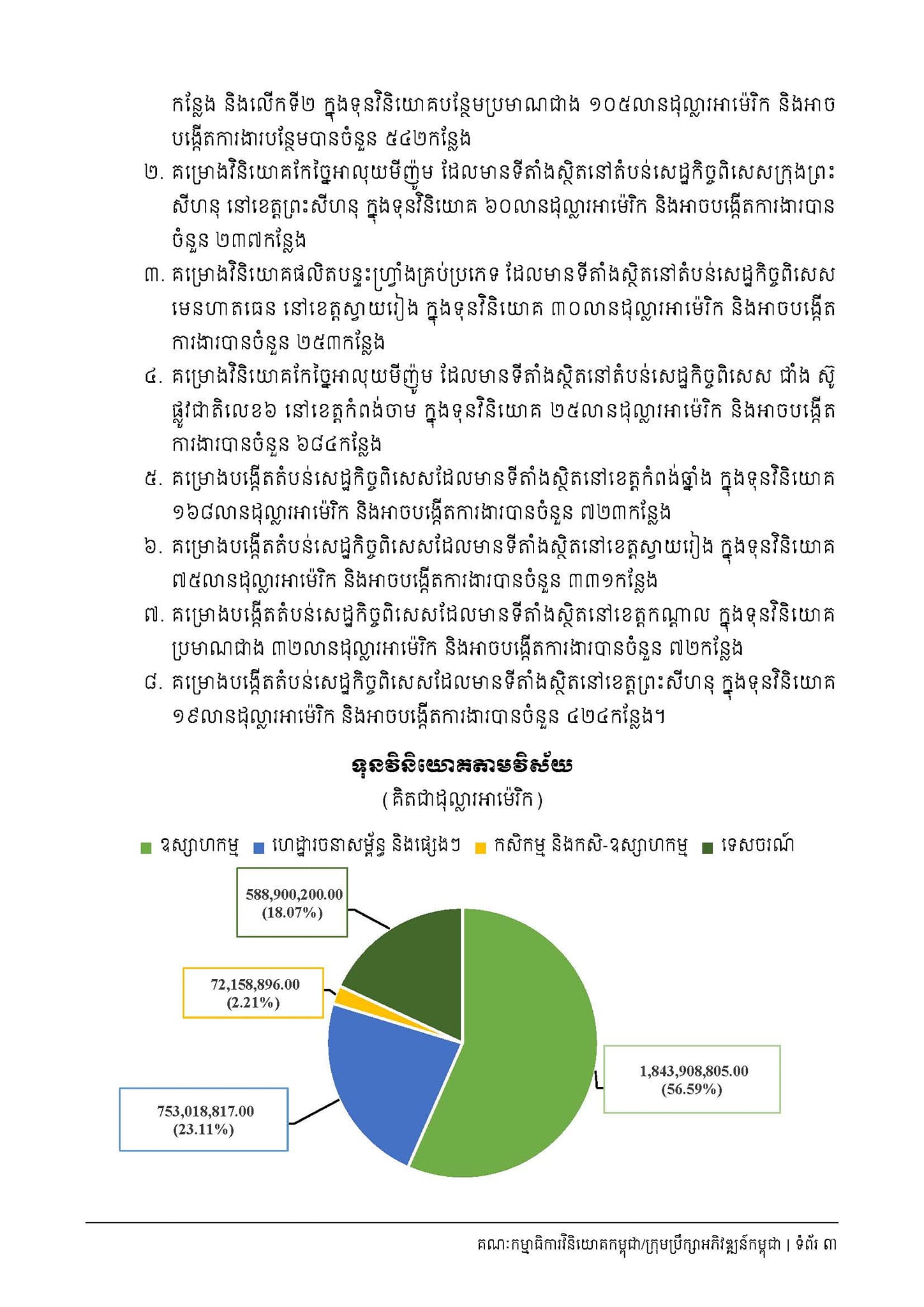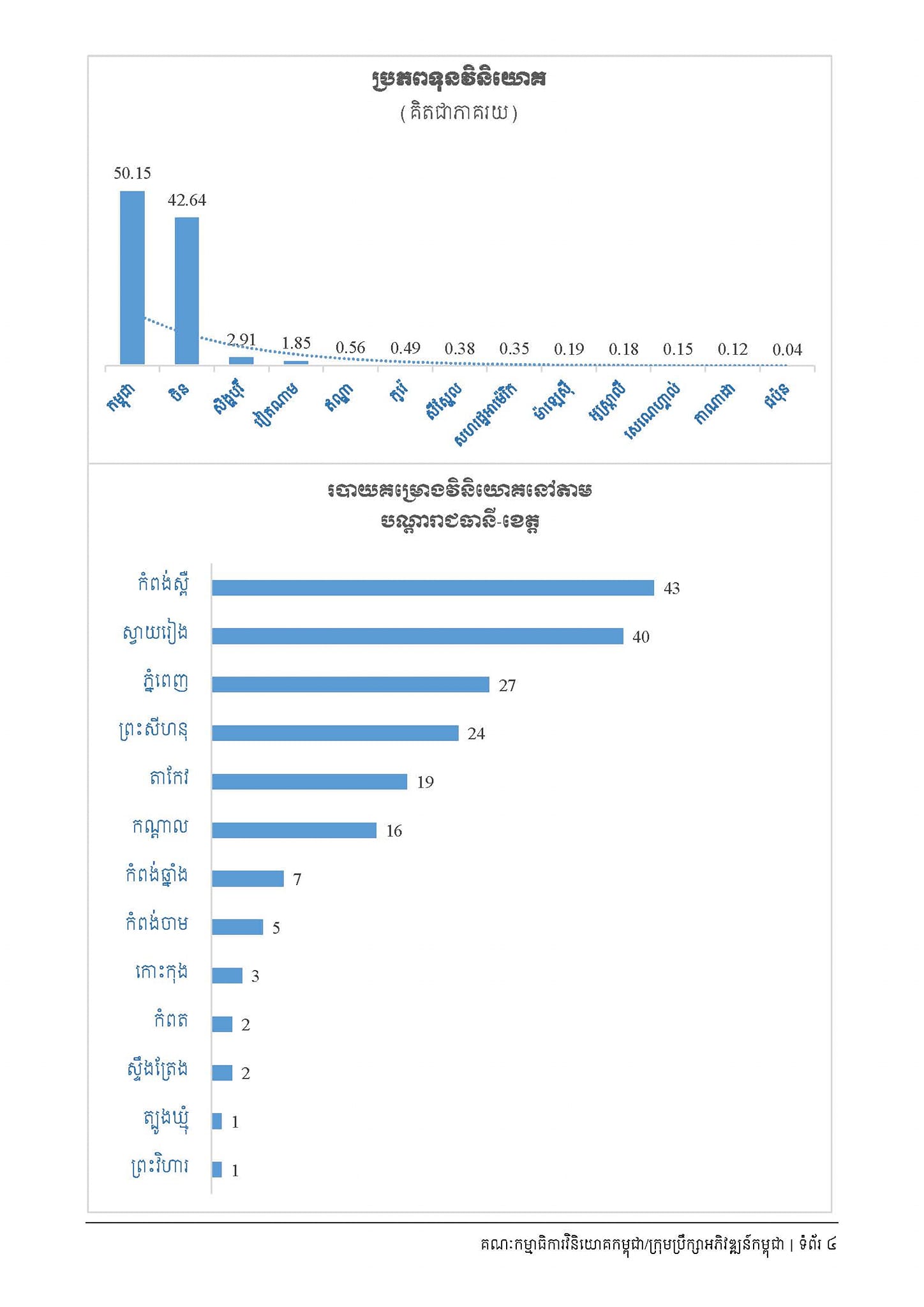 គួរបញ្ជាក់ផងដែរថា ក្នុងចំណោមគម្រោងវិនិយោគខាងលើ ខេត្ត កំពង់ស្ពឺ ទទួលបានគម្រោងវិនិយោគច្រើនជាងគេ បន្ទាប់មកមានខេត្ត ស្វាយរៀង ទីក្រុងភ្នំពេញ ខេត្តព្រះសីហនុ ខេត្តតាកែវ ខេត្ត កណ្ដាល ខេត្ត កំពង់ឆ្នាំង ខេត្ត កំពង់ចាម ខេត្ត កោះកុង ខេត្ត កំពត ខេត្ត ស្ទឹងត្រែង ខេត្តត្បូងឃ្មុំ និងខេត្តព្រះវិហារ៕