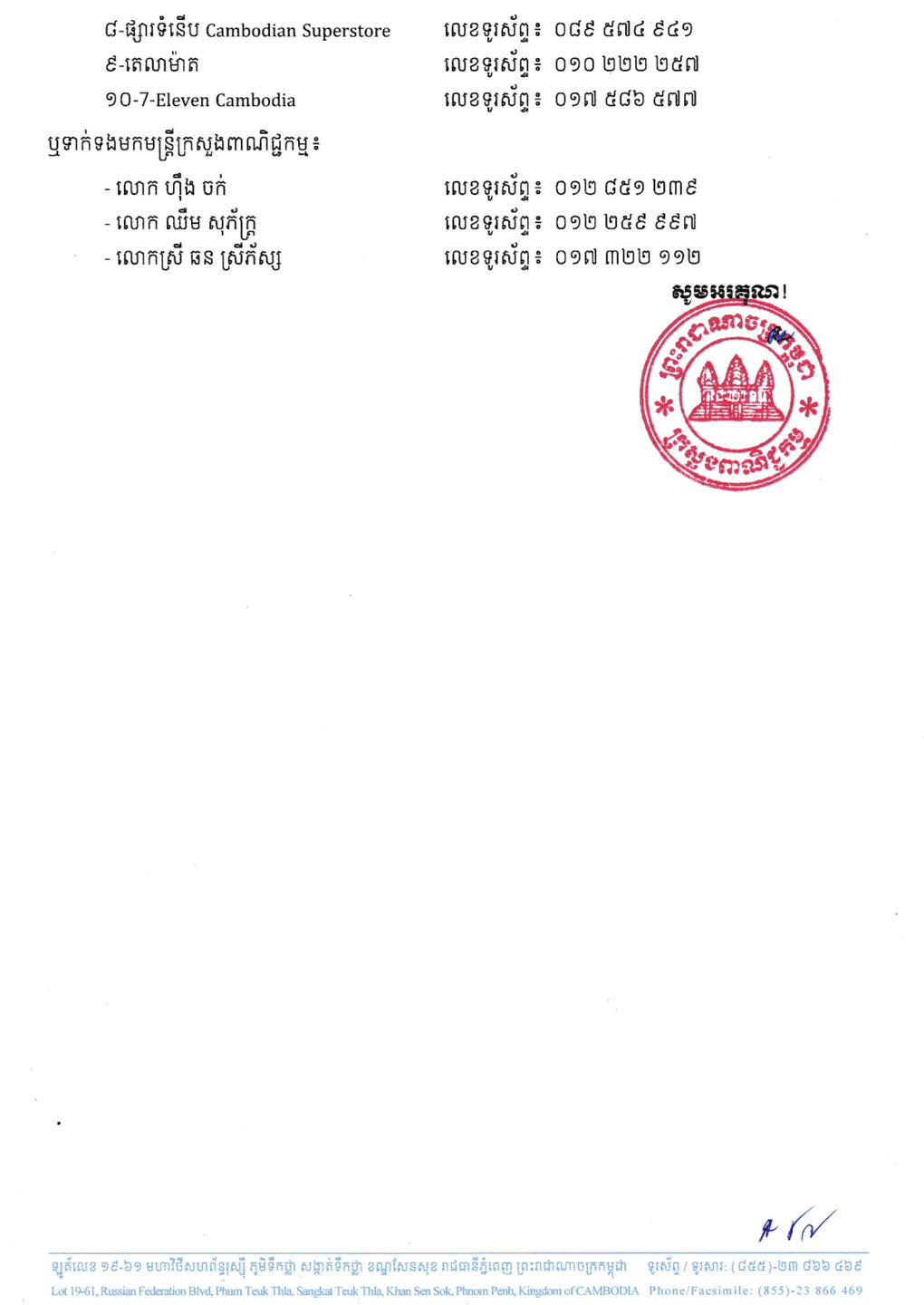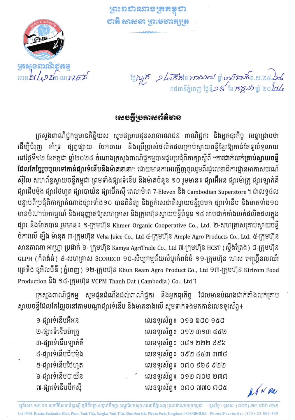 ក្រសួងពាណិជ្ជកម្ម នៅព្រឹកថ្ងៃទី២០ ខែកក្កដា ឆ្នាំ២០២៤ នេះ បានចេញសេចក្តីប្រកាសព័ត៌មានថ្មីមួយ ដោយបញ្ជាក់ឱ្យដឹងថា ផ្សារទំនើប និងម៉ាតល្បីៗនានា បានសម្រេចអនុញ្ញាតឱ្យសហគ្រាស ឬក្រុមហ៊ុន អាចដាក់លក់គ្រាប់ស្វាយចន្ទី ដែលកែច្នៃរួចបាន។