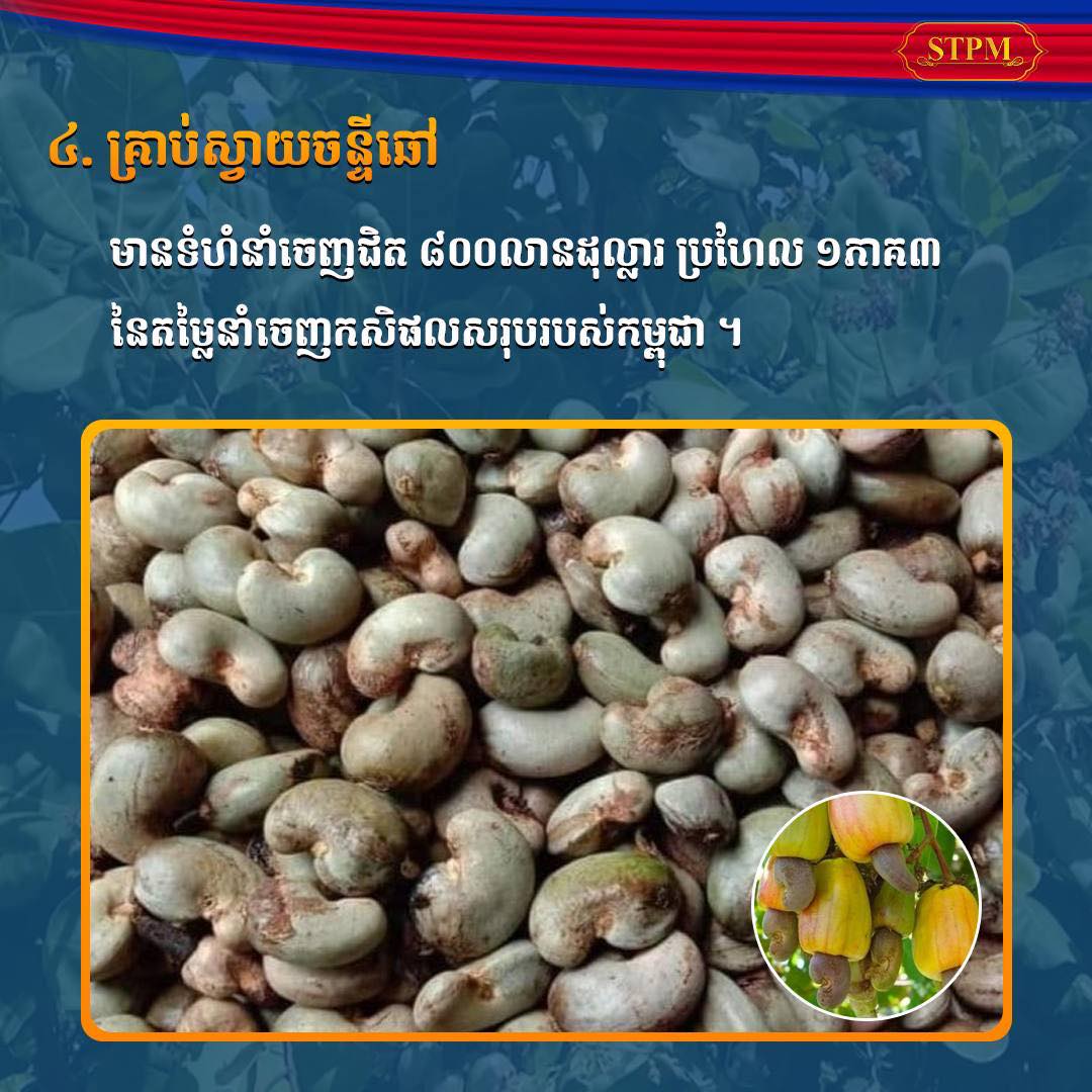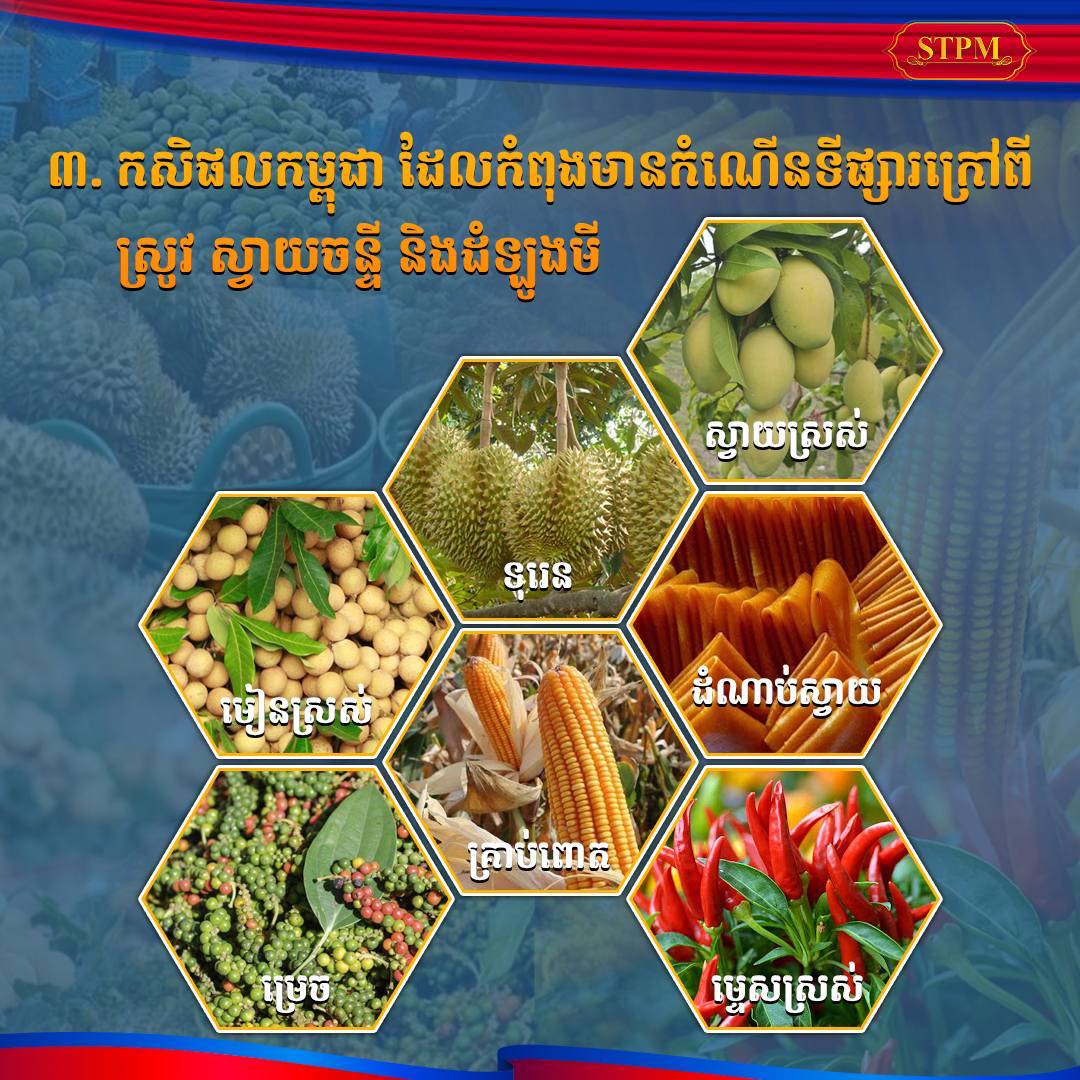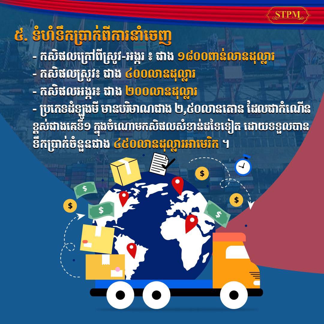 ចំពោះ ទំហំទឹកប្រាក់ពីការនាំចេញ កសិផលក្រៅពីស្រូវ-អង្ករ បានជាង ១៨០០លានដុល្លារ ខណៈកសិផលស្រូវ បានជាង៤០០លានដុល្លារ ,កសិផលអង្ករ បានជាង២០០លានដុល្លារ និង ឲប្រភេទដំឡូងមី មានបរិមាណជាង ២,៥០លានតោន ដែលជាកំណើនខ្ពស់ជាងគេទី១ ក្នុងចំណោមកសិផលសំខាន់ដទៃទៀត ដោយទទួលបានទឹកប្រាក់ចំនួនជាង ៤៥០លានដុល្លារអាមេរិក៕