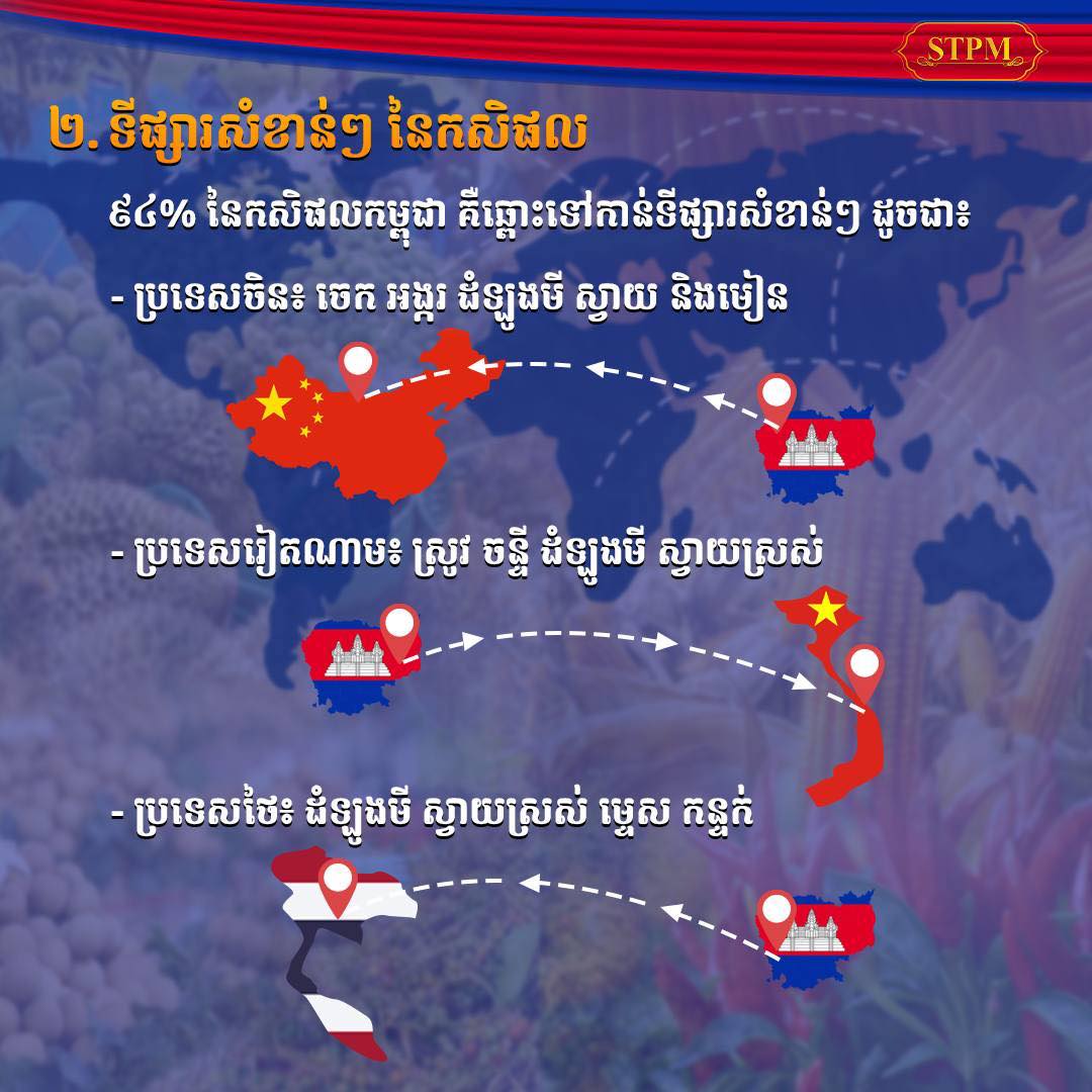 អង្គភាពអ្នកនាំពាក្យរាជរដ្ឋាភិបាល បានគូសបញ្ជាក់បន្ថែមថា កសិផលប្រមាណ ៦លានតោន បាននាំចេញទៅកាន់ទីផ្សារ គោលដៅចំនួន ៧៧ប្រទេសទូទាំងពិភពលោក។ ជាក់ស្ដែង ៩៤% នៃកសិផលកម្ពុជា គឺឆ្ពោះទៅកាន់ទីផ្សារសំខាន់ៗដូចជា៖ ប្រទេសចិន៖ ចេក អង្ករ ដំឡូងមី ស្វាយ និងមៀន, ប្រទេសរៀតណាម៖ ស្រូវ ចន្ទី ដំឡូងមី ស្វាយស្រស់ ,ប្រទេសថៃ៖ ដំឡូងមី ស្វាយស្រស់ ម្ទេស កន្ទក់។ កសិផលកម្ពុជា ដែលកំពុងមានកំណើនទីផ្សារក្រៅពីស្រូវ ស្វាយចន្ទី និងដំឡូងមី ៖ ស្វាយស្រស់ ដំណាប់ស្វាយ ទុរេន គ្រាប់ពោត មៀនស្រស់ ម្រេច និងម្ទេសស្រស់។ ចំណែកឯគ្រាប់ស្វាយចន្ទីឆៅ មានទំហំនាំចេញជិត ៨០០លានដុល្លារ ប្រហែល១ភាគ៣នៃតម្លៃនាំចេញ កសិផលសរុបរបស់កម្ពុជា។