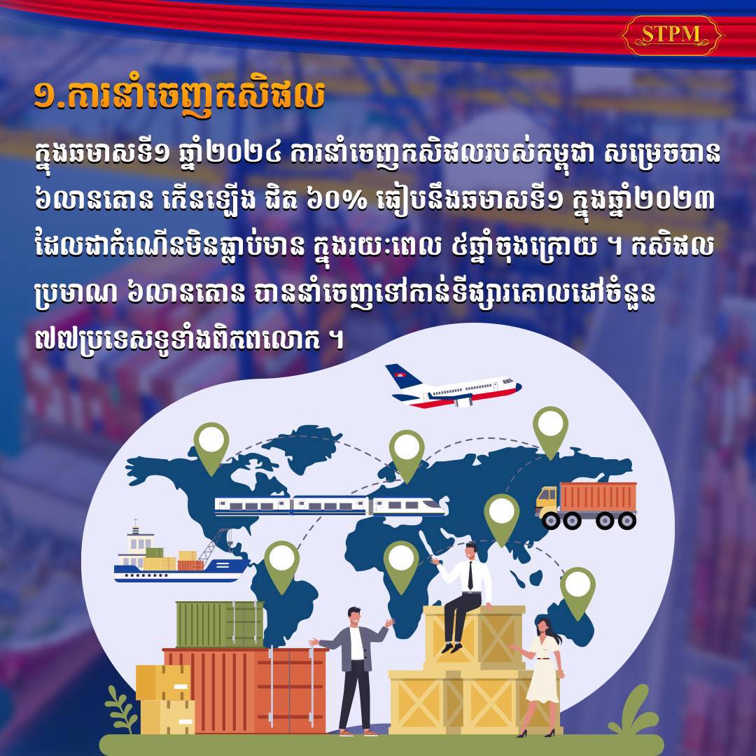 ឆមាសទី១ ឆ្នាំ២០២៤នេះ កម្ពុជាសម្រេចការនាំចេញកសិផលបានជាង ៦លានតោន កើនឡើងជិត៦០ភាគរយ និងជាកំណើនមិនធ្លាប់មានក្នុងរយៈពេល ៥ឆ្នាំចុងក្រោយ
