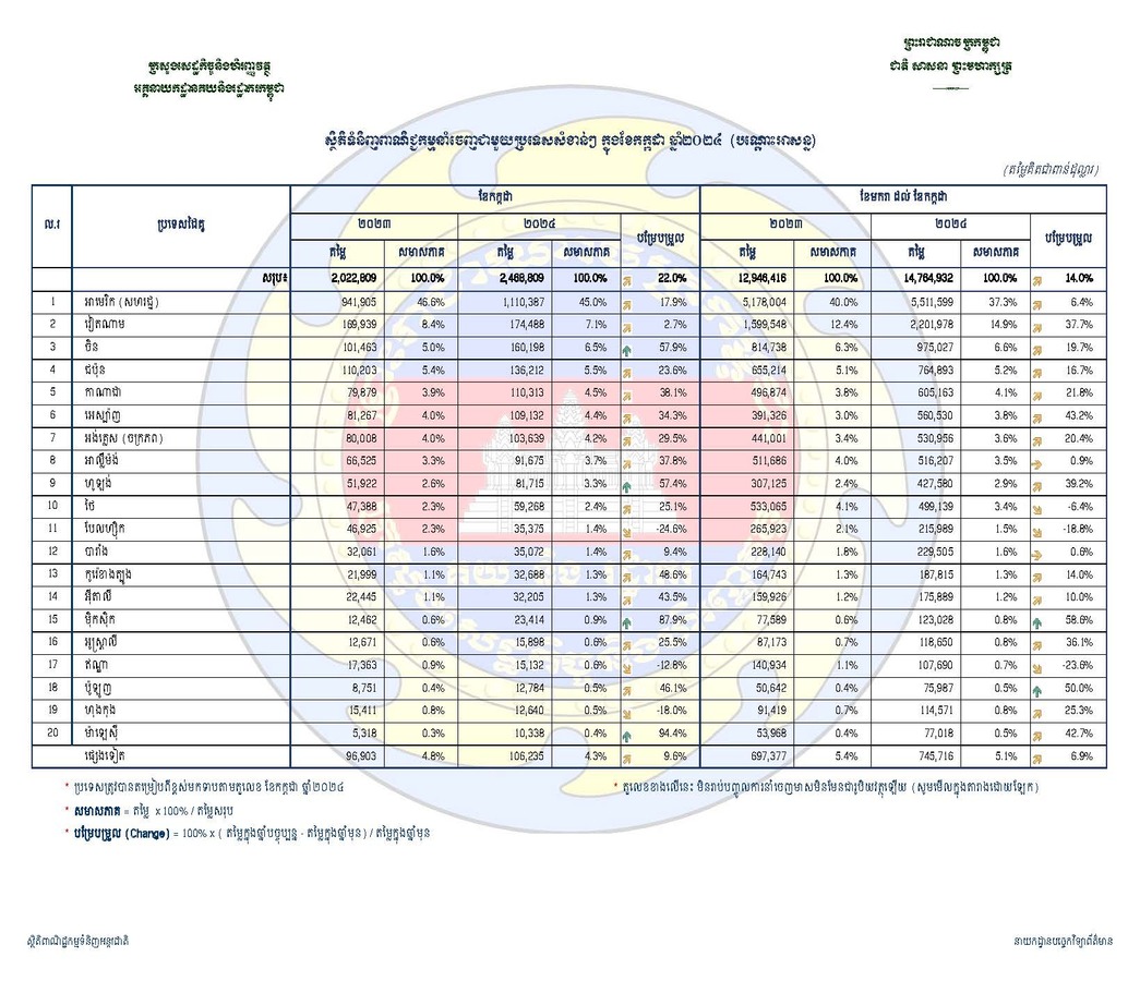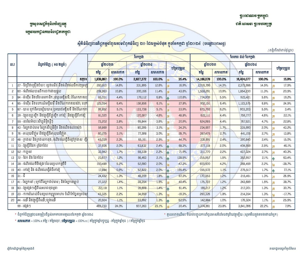 យោងតាមការចុះផ្សាយរបស់ ក្រសួងព័ត៌មាន បានឱ្យដឹងថា រយៈពេល ៧ខែ ក្នុងឆ្នាំ២០២៤ នេះ ការធ្វើពាណិជ្ជកម្មជាមួយប្រទេសដៃគូសំខាន់ៗរបស់កម្ពុជាចំនួន ២០ និងបណ្តាប្រទេសមួយចំនួនផ្សេងទៀត គិតជាទឹកប្រាក់សរុបមានចំនួនជាង ៣១ពាន់លានដុល្លារអាមេរិក កើនឡើង ១៥ ភាគរយ បើធៀបរយៈពេលដូចគ្នាឆ្នំា ២០២៣ ក្នុងនោះបើគិតរយៈពេល ៧ខែនេះ សម្រាប់ការធ្វើពាណិជ្ជកម្មលើទីផ្សារអន្តរជាតិរបស់កម្ពុជា មានកំណើនកើនឡើងជាបន្តបន្ទាប់គួរកត់សម្គាល់។ នេះបើយោងតាមស្ថិតិពាណិជ្ជកម្ម នៃការធ្វើពាណិជ្ជកម្មលើ ទីផ្សារអន្តរជាតិ ដែលចេញផ្សាយដោយអគ្គនាយកដ្ឋានគយ និងរដ្ឋាករកម្ពុជា នៃក្រសួងសេដ្ឋកិច្ច និងហិរញ្ញវត្ថុ។