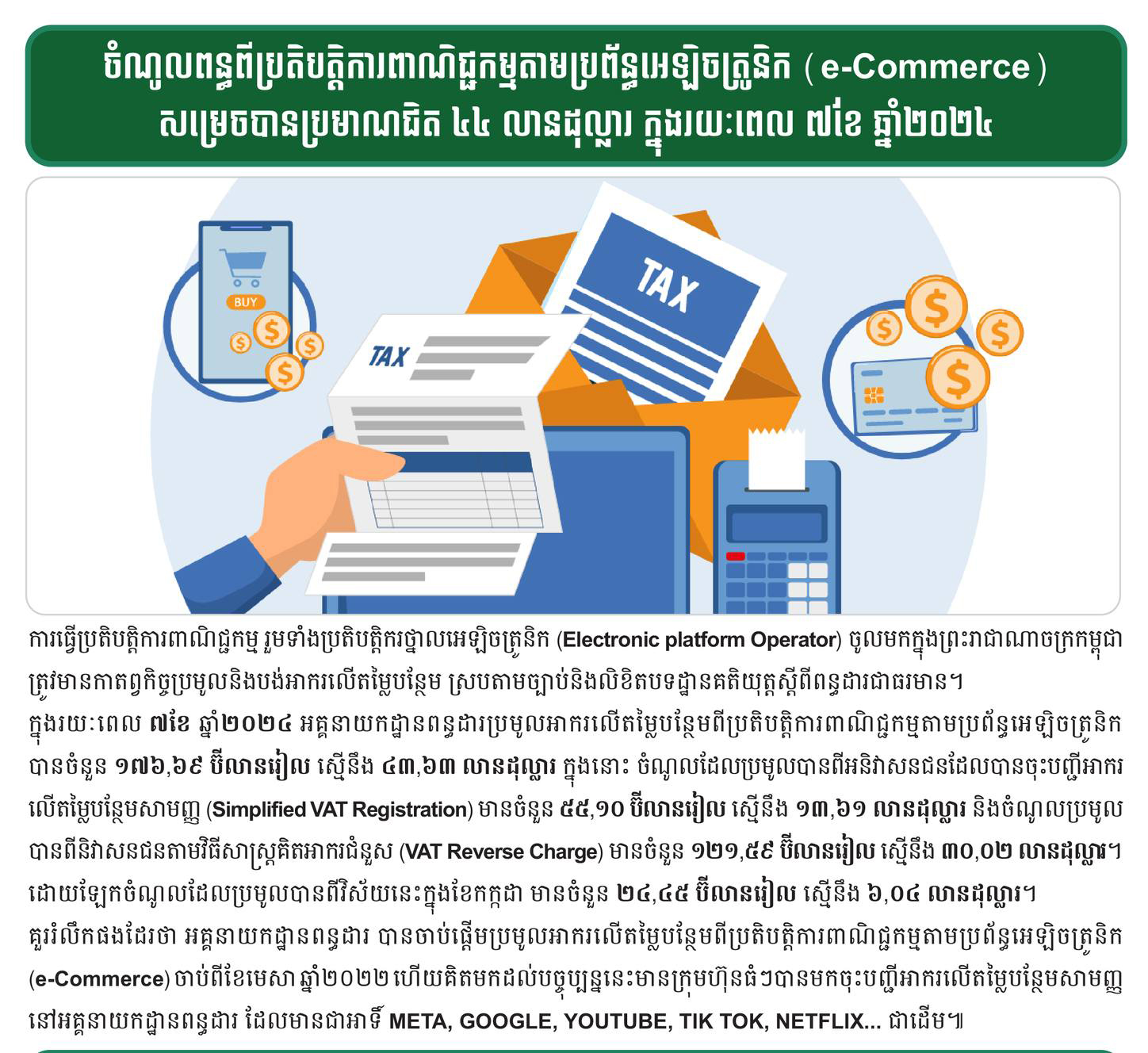 ព្រឹត្ដិបត្រព័ត៌មានរបស់អគ្គនាយកដ្ឋានពន្ធដារ ចេញផ្សាយកាលពីថ្ងៃព្រហស្បតិ៍ទី១៥ ខែសីហា ឆ្នាំ២០២៤កន្លងទៅថ្មីនេះ បានឱ្យដឹងថា ចំណូលពន្ធពីប្រតិបត្តិការពាណិជ្ជកម្មតាមប្រព័ន្ធអេឡិចត្រូនិក (e-Commerce) ក្នុងរយៈពេលប្រាំពីរខែ ឆ្នាំ២០២៤ សម្រេចបានប្រមាណជិត ៤៤លានដុល្លារ ។