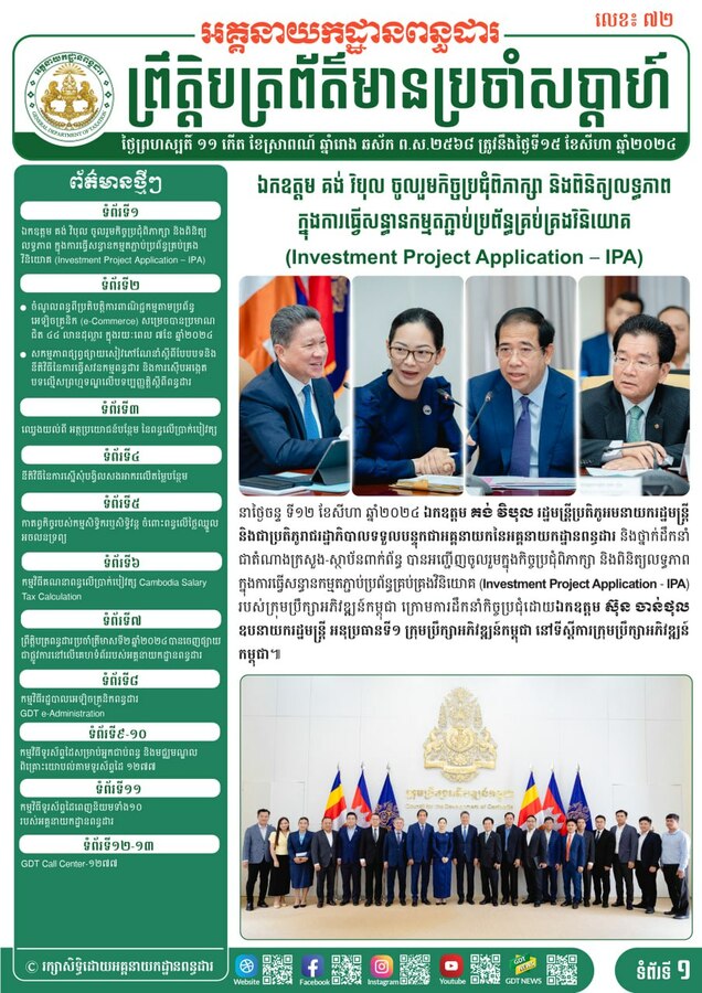 សូមជម្រាបថាអគ្គនាយកដ្ឋានពន្ធដារបានចាប់ផ្តើមប្រមូលអាករលើតម្លៃបន្ថែមពីប្រតិបត្តិការពាណិជ្ជកម្មតាមប្រព័ន្ធអេឡិច ត្រូនិក (e-Commerce) ចាប់ពីខែមេសា ឆ្នាំ២០២២ ហើយគិតមកដល់បច្ចុប្បន្ននេះ មានក្រុមហ៊ុនធំៗបានមកចុះបញ្ជីអាករ លើតម្លៃបន្ថែមសាមញ្ញនៅអគ្គនាយកដ្ឋានពន្ធដារ ដែលមានជាអាទិ៍ META, GOOGLE, YOUTUBE, TIK TOK, NETFLIX ជាដើម។