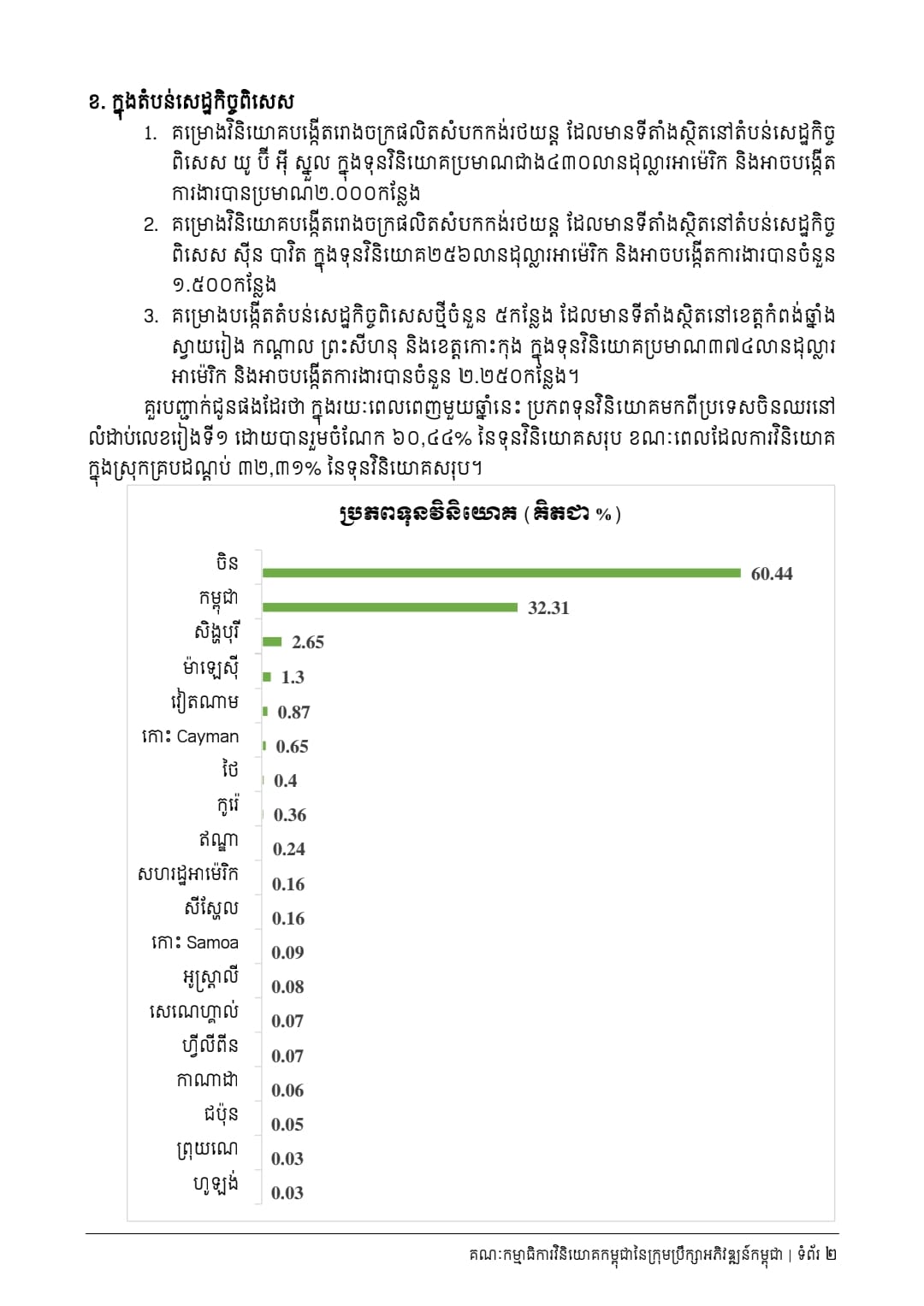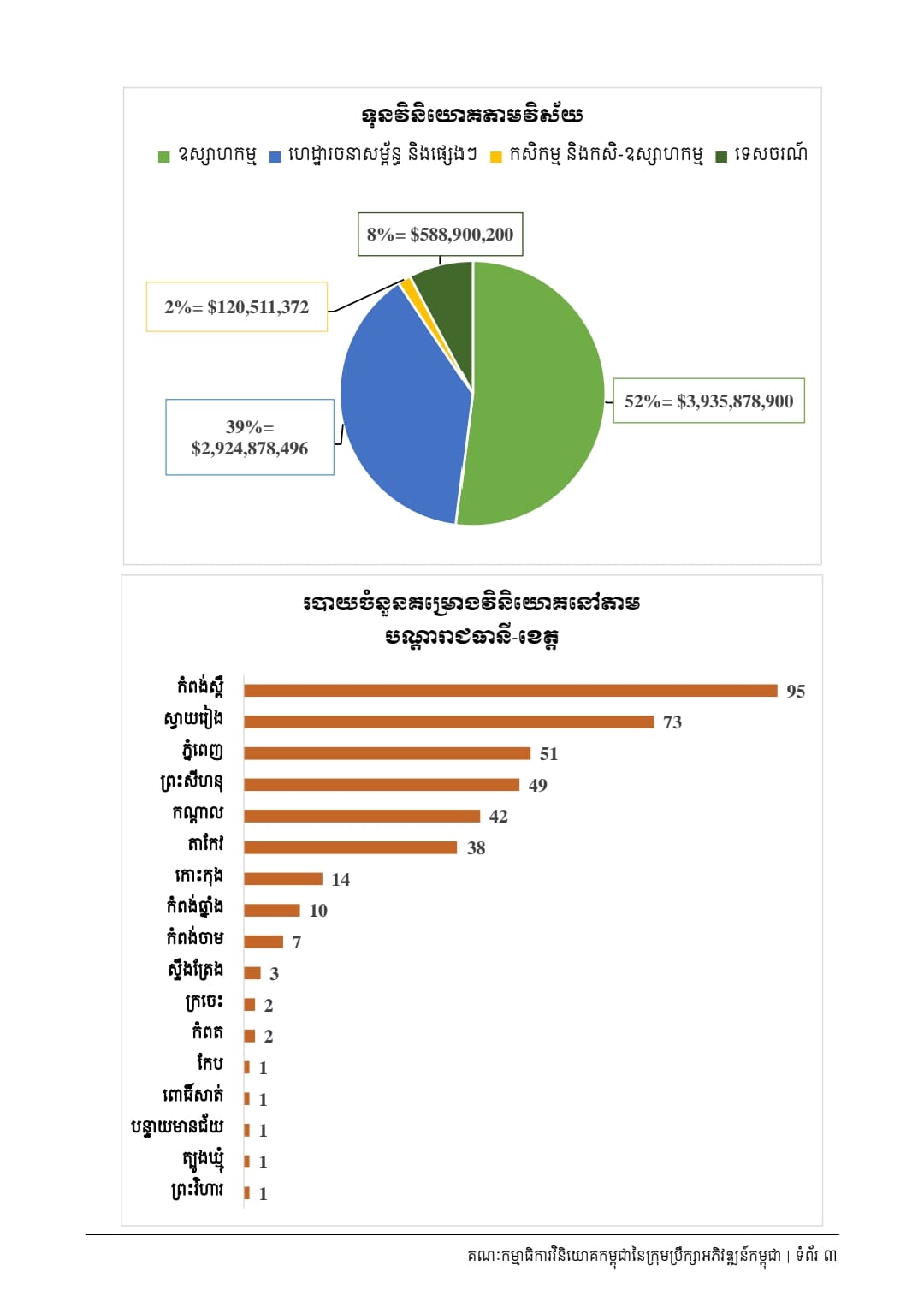 ជារួមក្នុងរយៈពេល ១ឆ្នាំនេះ ការអនុម័តគម្រោងវិនិយោគមានការកើន ឡើងចំនួន ១៦៨ គម្រោង ខណៈទុនវិនិយោគមានការកើនឡើងគួរឱ្យកត់សម្គាល់ដល់ទៅប្រមាណ ៤.៦៧២លានដុល្លារអាម៉េរិក ស្មើនឹង ប្រមាណ១៦១% ធៀបនឹងរយៈពេលដូចគ្នា ១ឆ្នាំចុងក្រោយនៃរាជ រដ្ឋាភិបាល នីតិកាលទី៦។ ការកើនឡើងយ៉ាងគំហុកនេះ គឺដោយសារវត្តមាននៃគម្រោងថ្មី នៅក្នុងវិស័យ ហេដ្ឋារចនាសម្ព័ន្ធ, វិស័យឧស្សាហកម្ម, វិស័យទេសចរណ៍ និងគម្រោងបង្កើតតំបន់សេដ្ឋកិច្ចពិសេស៕