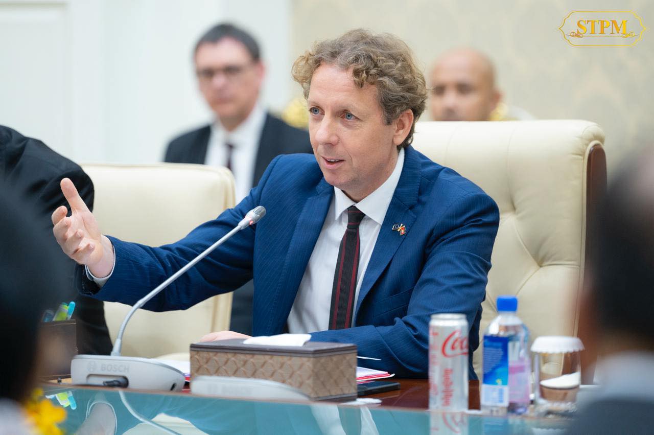 ឯកឧត្តម Igor Driesmans ឯកអគ្គរដ្ឋទូតសហភាពអឺរ៉ុបប្រចាំកម្ពុជា និងជាប្រធានគណៈប្រតិភូ បានវាយតម្លៃខ្ពស់ចំពោះកិច្ចសហប្រតិបត្តិការរវាងសហភាពអឺរ៉ុប និងកម្ពុជា ជាពិសេសលើវិស័យពាណិជ្ជកម្ម វិនិយោគ និងសេដ្ឋកិច្ច។ ក្នុងឱកាសនៃជំនួបនោះដែរ លោក Tassilo Brinzer ប្រធានសភាពាណិជ្ជកម្មអឺរ៉ុបនៅកម្ពុជា (EuroCham Cambodia) បានអបអរសាទរចំពោះសមិទ្ធផលគួរឱ្យកត់សម្គាល់ ដែលរាជរដ្ឋាភិបាលកម្ពុជា សម្រេចបានក្នុងរយៈពេលមួយឆ្នាំកន្លងមកនេះ។