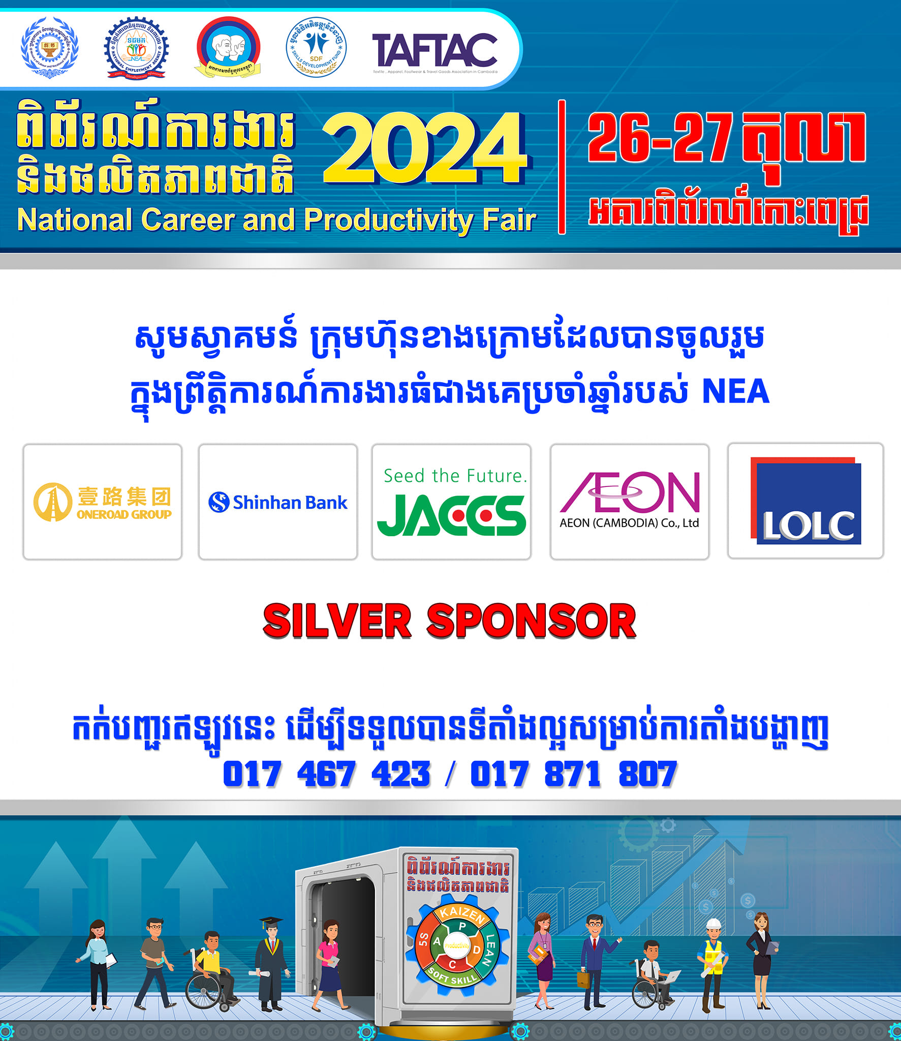 ដូច្នេះ សម្រាប់ យុវជន សិស្ស/និសិ្សត និងអ្នកស្វែងរកការរងារ កុំភ្លេចត្រៀម CV អោយបានច្រើន ដើម្បីចូលរួមដាក់ពាក្យ និងសម្ភាសការងារភ្លាមៗជាមួយតំណាងក្រុមហ៊ុនធំៗជាច្រើន និង អាចចូលរួមក្នុងសិក្ខាសាលាអំពីការលើកកម្ពស់ផលិតភាពដែលមានការចែករំលែកចំណេះដឹង និងបទពិសោធន៍ល្អៗពីសំណាក់វាគ្មិនជាតិ និងអន្តរជាតិជាច្រើនផងដែរ។ ព័ត៌មានបន្ថែម សូមទាក់ទងមកលេខ 017 467 423 ឬ 017 871 807 ឬ Call Center លេខ ១២៩៧ ឬ ១២៨៦៕