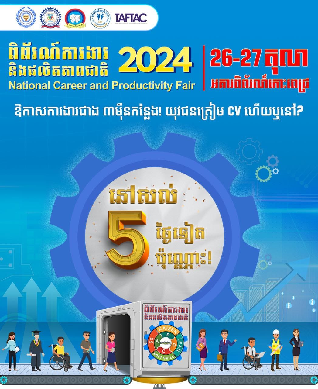 នៅសល់តែ ៥ ថ្ងៃ ទៀតប៉ុណ្ណោះ ពិព័រណ៍ការងារ និងផលិតភាពជាតិ ឆ្នាំ២០២៤ ជាមួយឱកាសការងារសរុបជាង ៣ម៉ឺន កន្លែងពីក្រុមហ៊ុនធំៗ ១៥០ នឹងចាប់ផ្តើមហើយ