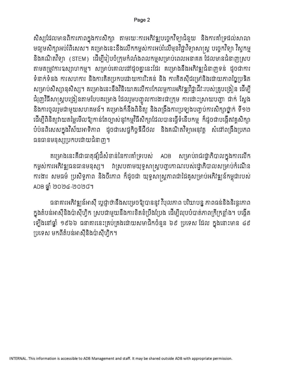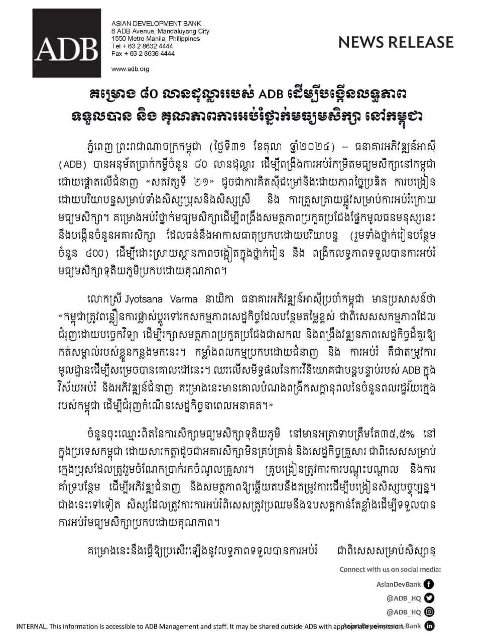 ធនាគារ ADB កាលពីថ្ងៃទី៣០ ខែតុលា ឆ្នាំ២០២៤ ម្សិលមិញនេះ បានអនុម័តប្រាក់កម្ចីចំនួន ៨០ លានដុល្លារ ដើម្បីពង្រឹងការអប់រំកម្រិតមធ្យមសិក្សានៅកម្ពុជា ដោយផ្តោតលើជំនាញ «សតវត្សទី ២១» ដូចជាការគិតស៊ីជម្រៅនិងដោយភាពច្នៃប្រឌិត ការបង្រៀន ដោយបរិយាបន្នសម្រាប់ទាំងសិស្សប្រុសនិងសិស្សស្រី និង ការត្រួសត្រាយផ្លូវសម្រាប់ការអប់រំក្រោយ មធ្យមសិក្សា។