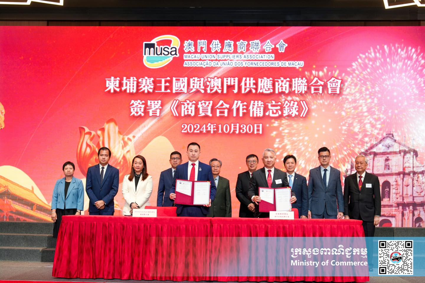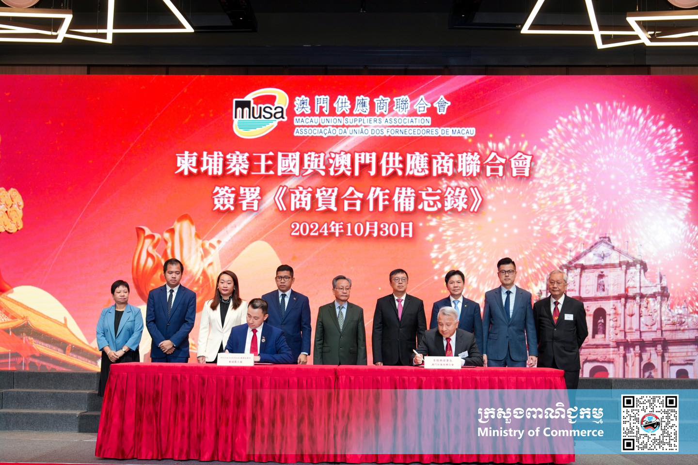 (ម៉ាកាវ, ចិន)៖ យោងតាមការចុះផ្សាយរបស់ ក្រសួងពាណិជ្ជកម្ម កាលពីល្ងាចថ្ងៃពុធ ទី៣០ ខែតុលា ឆ្នាំ២០២៤ ក្រសួងពាណិជ្ជកម្មតំណាងដោយ ឯកឧត្តម លឹម ឡោកពិសិដ្ឋ រដ្ឋលេខាធិការ ក្រសួងពាណិជ្ជកម្ម និងសមាគមសហព័ន្ធអ្នកផ្គត់ផ្គង់ម៉ាកាវ នៃតំបន់រដ្ឋបាលពិសេសម៉ាកាវ សាធារណៈរដ្ឋប្រជាមានិតចិន តំណាងដោយ លោក KIT HENG LEI នាយកប្រតិបត្តិសមាគមសហព័ន្ធអ្នកផ្តត់ផ្គង់ម៉ាកាវ (MUSA) បានចុះអនុស្សារណៈយោគយល់គ្នា ដើម្បីភ្ជាប់ទំនាក់ទំនងជាមួយទីផ្សារដៃគូដែលមានអ្នកផ្គត់ផ្គង់ និងអ្នកបញ្ជាទិញផលិតផលជាច្រើនប្រភេទចូលទៅកាន់ទីផ្សារទំនិញ ផ្សារទំនើបតូច-ធំ ភោជនីយដ្ឋាន សណ្ឋាគារ និងរីហ្សត ប្រមាណជាង ១០០០កន្លែង នៅទូទាំងទីក្រុងម៉ាកាវ និងហុងកុង។
