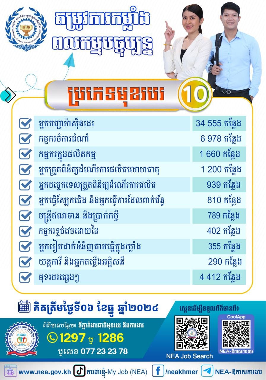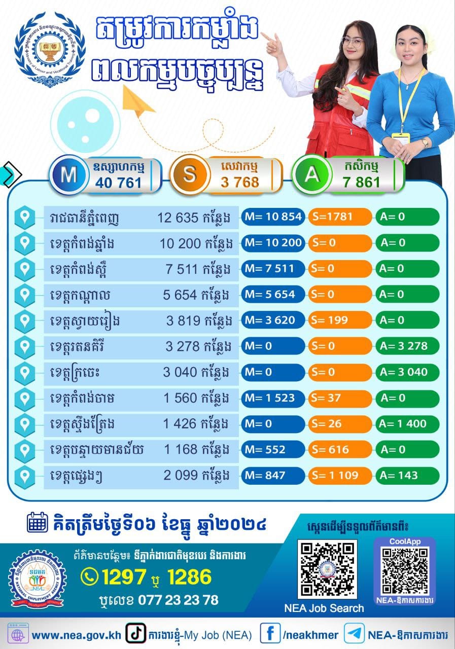 ក្រសួងការងារ បានគូសបញ្ជាក់ថា ឱកាសការងារចំនួន ៥២ ៣៩០ កន្លែង មាននៅតាមបណ្ដារាជធានី-ខេត្ត ក្នុងនោះផ្នែកឧស្សហកម្ម ចំនួន ៤០ ៧៦១ ផ្នែកសេវាកម្ម ចំនួន ៣៧៦៨ និងផ្នែកកសិកម្ម ចំនួន ៧៨៦១។ ជាមួយគ្នានេះដែរ អ្នកបញ្ជាម៉ាស៊ីនដេរ ,កម្មករចំការដំណាំ ,កម្មករក្នុងផលិតកម្ម ,អ្នកត្រួតពិនិត្យដំណើរការការផលិតផលលោហធាតុ ,អ្នកបច្ចេកទេសត្រួតពិនិត្យដំណើរការផលិត អ្នកធ្វើស្បែកជើង និងអ្នកធ្វើការដែលពាក់ព័ន្ធ ,មន្រ្តីឥណទាន និងប្រាក់កម្ចី ,កម្មករវេចខ្ចប់ដោយដៃ ,អ្នករៀបដាក់ទំនិញតាមធ្វើក្នុងឃ្លាំង ,យន្តការិ និងអ្នកតម្លើងអគ្គិសនី និងមុខរបរផ្សេងៗ។