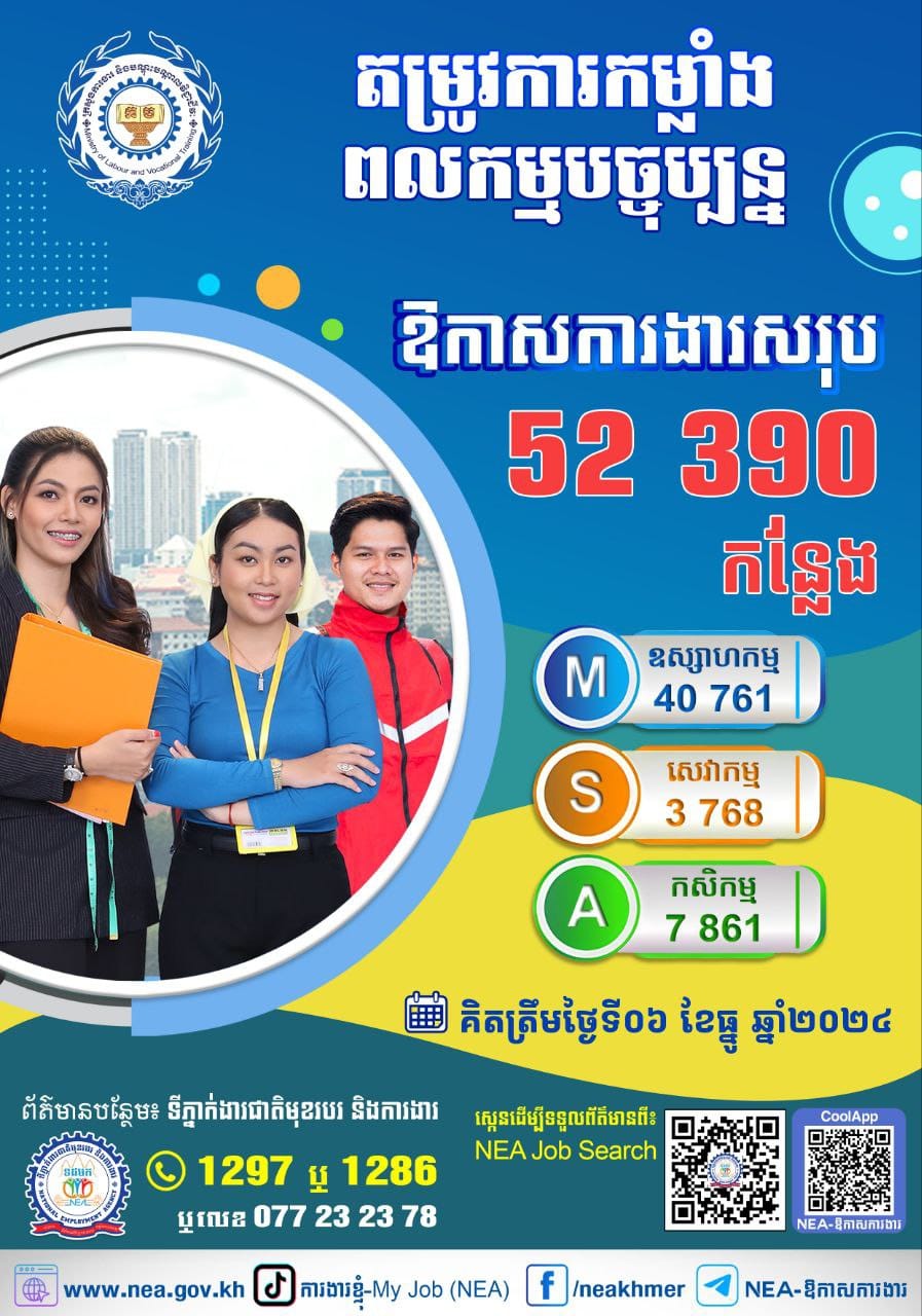 យោងតាមការចុះផ្សាយរបស់ ក្រសួងការងារ និងបណ្ដាលវិជ្ជាជិវៈ បានឱ្យដឹងថា គិតត្រឹមថ្ងៃទី៦ ខែធ្នូ​ ឆ្នាំ២០២៤នេះ មានការងាររហូតដល់ទៅចំនួន ៥២ ៣៩០ កន្លែងកំពុងផ្ដល់ជូនបងប្អូនប្រជាពលរដ្ឋ យុវជន សិស្ស និងនិស្សិត។