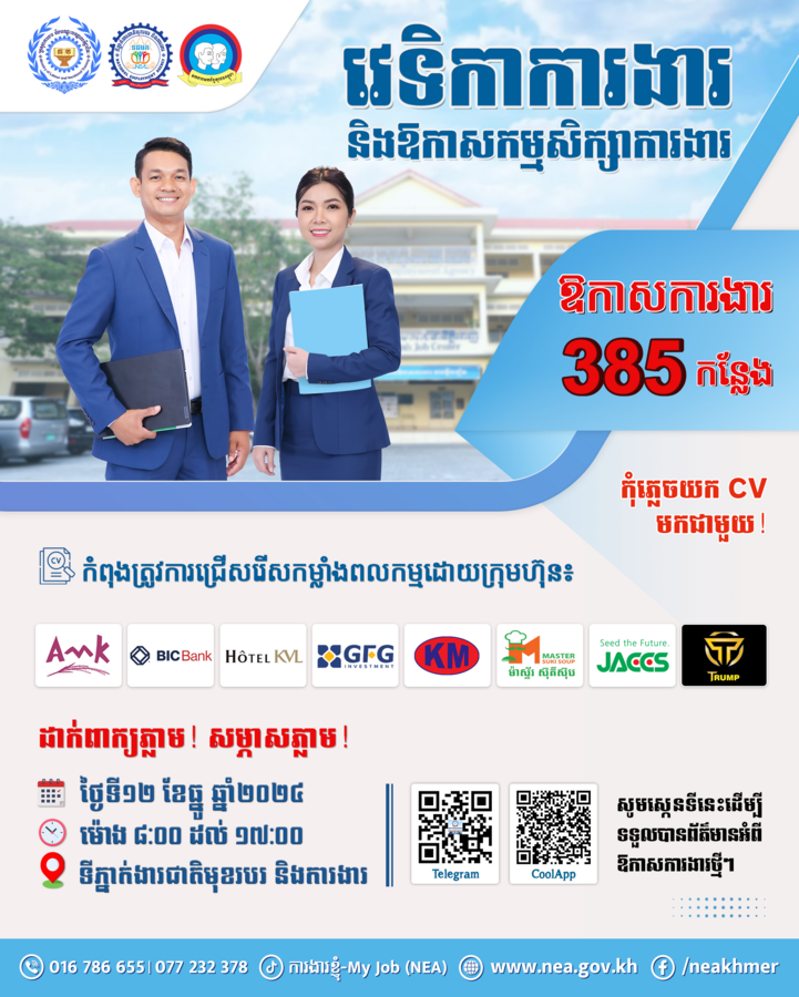 យោងតាមការចុះផ្សាយរបស់ ក្រសួងព័ត៌មាន បានឱ្យដឹងថា ទីភ្នាក់ងារជាតិមុខរបរ និងការងារ (NEA) នៃក្រសួងការងារ និងបណ្តុះបណ្តាលវិជ្ជាជីវៈ សហការជាមួយសហភាពសហព័ន្ធយុវជនកម្ពុជាវិស័យការងារ សន្តិសុខសង្គម និងបណ្តុះបណ្តាលវិជ្ជាជីវៈ នឹងរៀបចំ វេទិកាការងារ និងកម្មសិក្សាការងារ នៅថ្ងៃទី១២ ខែធ្នូ ឆ្នាំ២០២៤ ខាងមុខនេះ ដោយនាំយកឱកាសការងារថ្មីបន្ថែមទៀតចំនួន៣៨៥ កន្លែង ពីក្រុមហ៊ុនធំៗ ៨ សម្រាប់ផ្តល់ជូនយុវជន សិស្ស/និស្សិត និងអ្នកកំពុងស្វែងរកការងារធ្វើ។