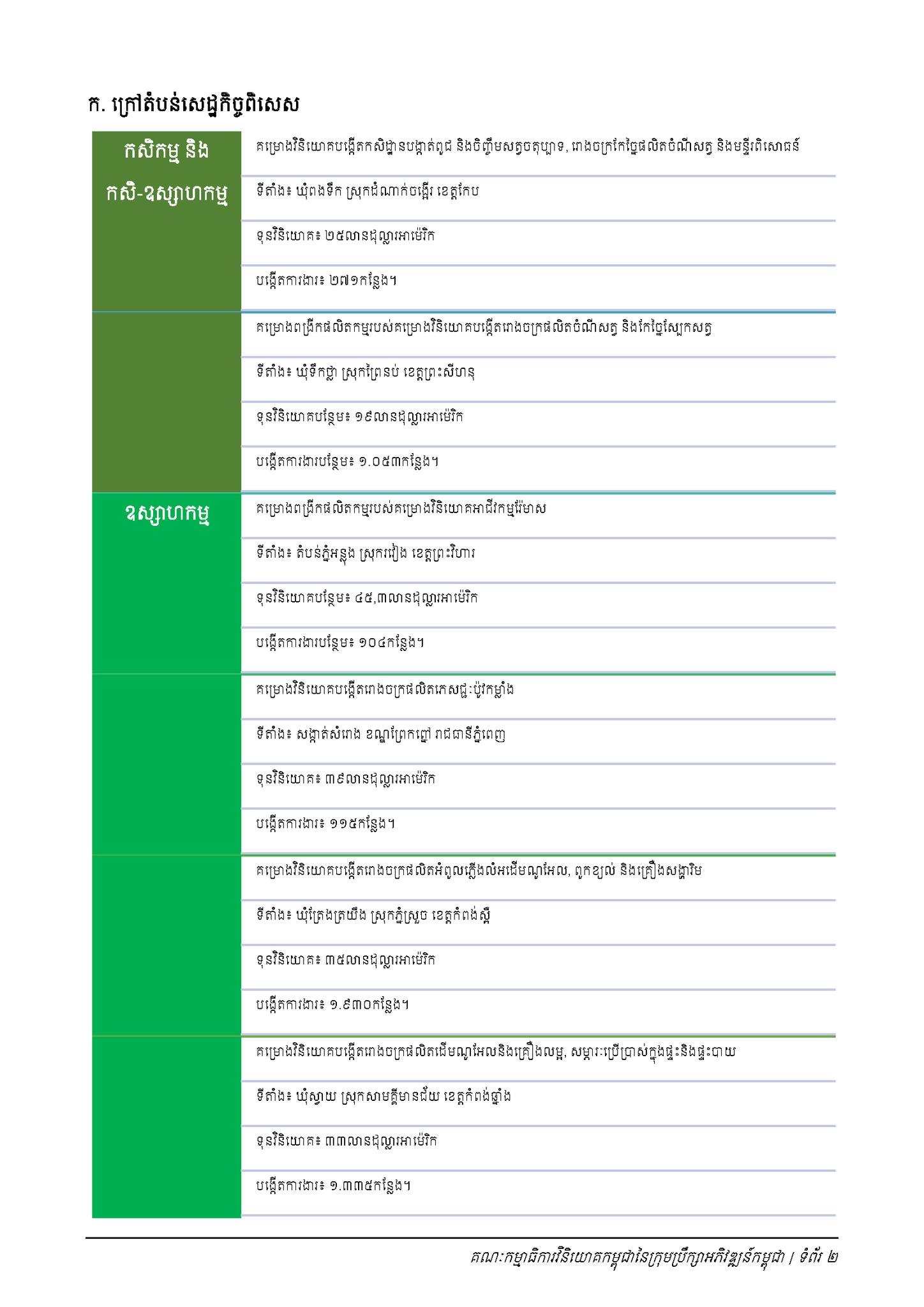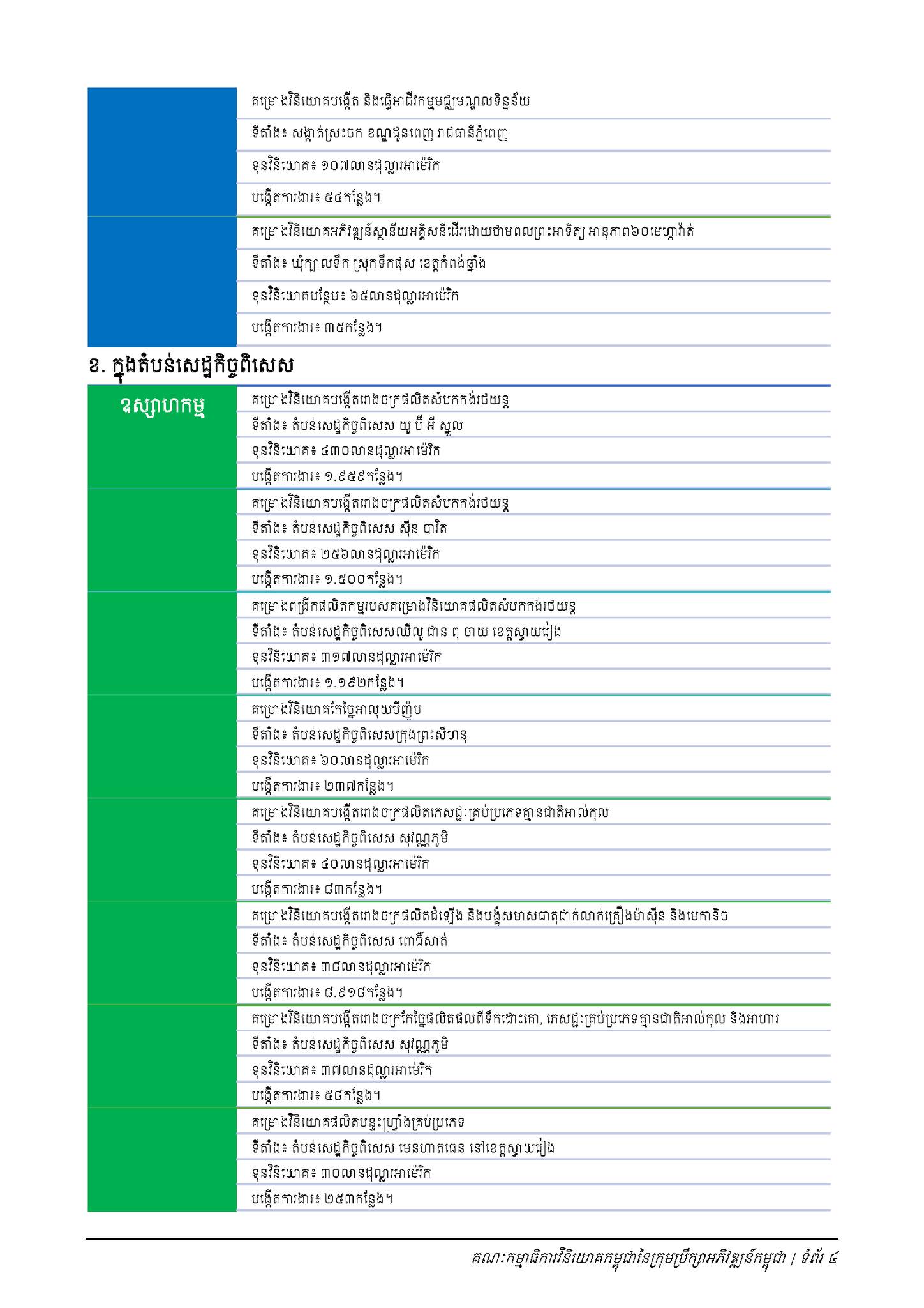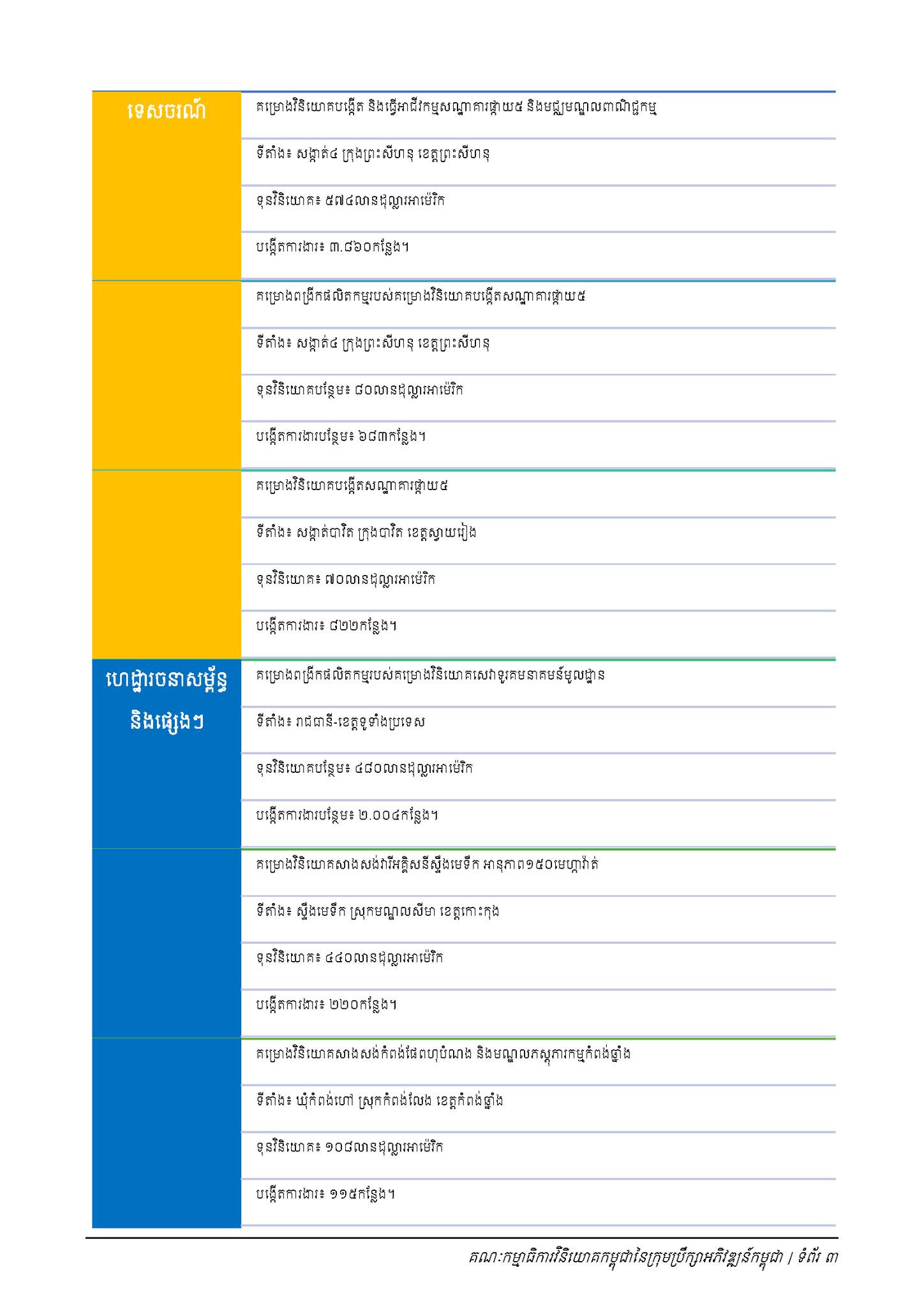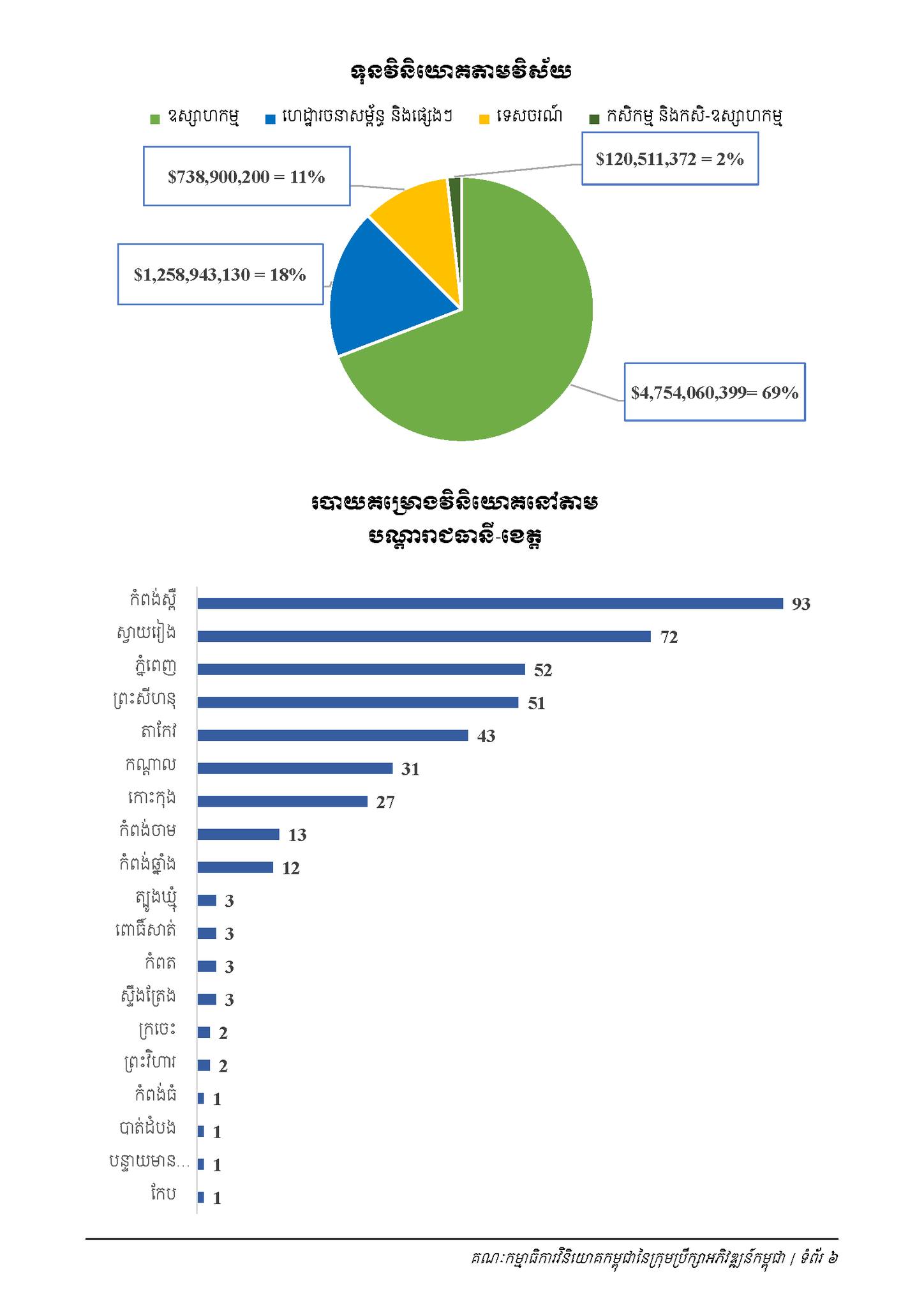 ទន្ទឹមនេះវិស័យកសិកម្ម និងកសិ- ឧស្សាហកម្មមានចំនួន ៨គម្រោង ក្នុងទុនវិនិយោគសរុបជាង ១២១លានដុល្លារ ស្មើនឹង ២%, វិស័យទេសចរណ៍មានចំនួន ៤គម្រោង ក្នុងទុនវិនិយោគសរុបប្រមាណ ៧៣៨លានដុល្លារស្មើនឹង ១១%, វិស័យហេដ្ឋារចនាសម្ព័ន្ធ និងផ្សេងៗ មានគម្រោងវិនិយោគចំនួន ៨គម្រោង ក្នុងទុនវិនិយោគសរុប ប្រមាណជាង ១.៣ពាន់លានដុល្លារស្មើនឹងប្រមាណ ១៨% នៃទុនវិនិយោគសរុប៕