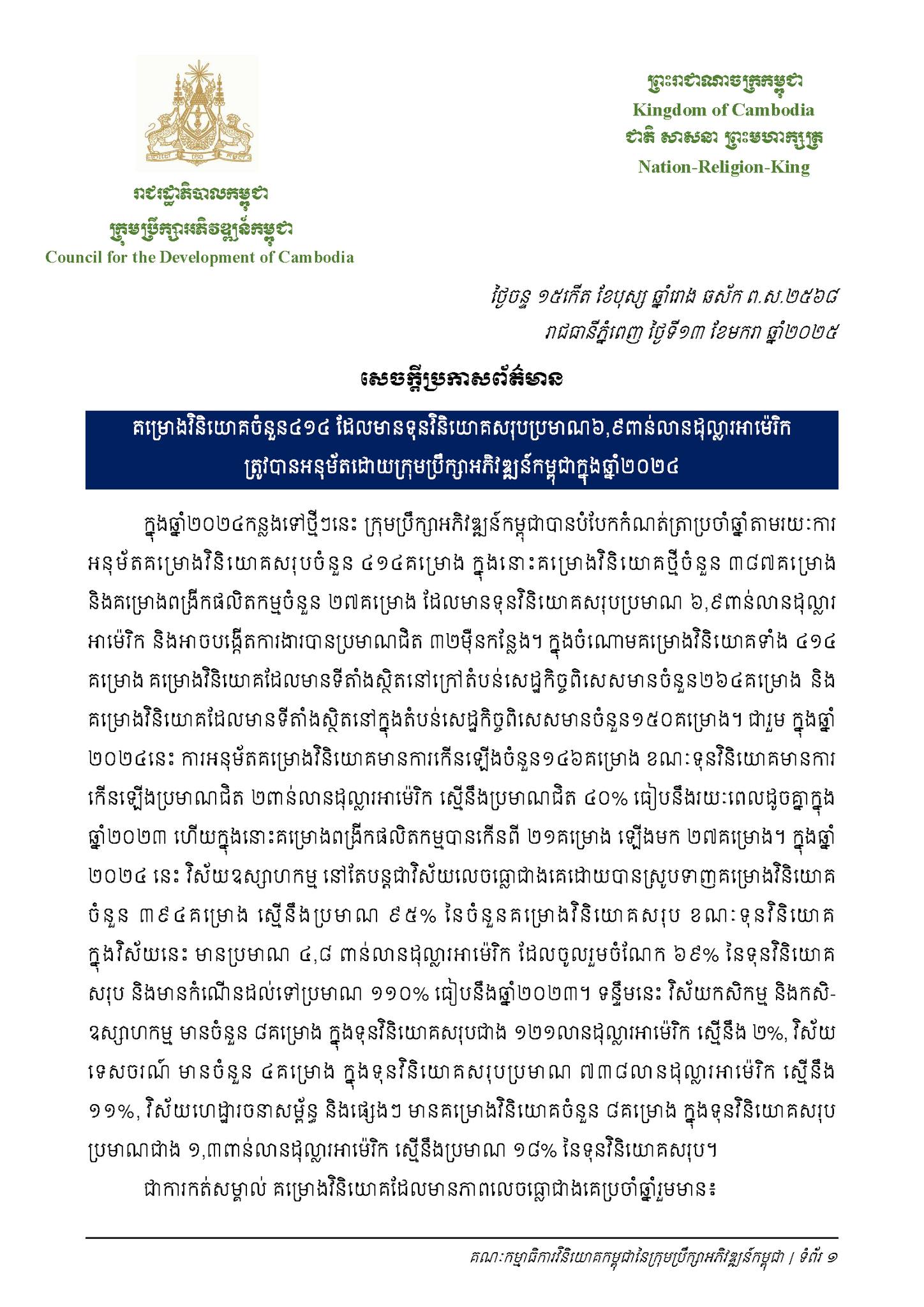 ក្នុងសេចក្ដីប្រកាសព័ត៌មាន ក្រុមប្រឹក្សាអភិវឌ្ឍន៍កម្ពុជា បានគូសបញ្ជាក់ថា ក្នុងឆ្នាំ២០២៤កន្លងទៅថ្មីៗនេះ ក្រុមប្រឹក្សាអភិវឌ្ឍន៍កម្ពុជា បានបំបែកកំណត់ត្រាប្រចាំឆ្នាំ តាមរយៈការអនុម័តគម្រោងវិនិយោគសរុបចំនួន ៤១៤គម្រោង ក្នុងនោះគម្រោងវិនិយោគថ្មីចំនួន ៣៨៧គម្រោង និងគម្រោងពង្រីកផលិតកម្មចំនួន ២៧គម្រោង ដែលមានទុនវិនិយោគសរុបប្រមាណ ៦.៩ពាន់លានដុល្លារ អាម៉េរិក និងអាចបង្កើតការងារបានប្រមាណជិត ៣២ម៉ឺនកន្លែង»។
