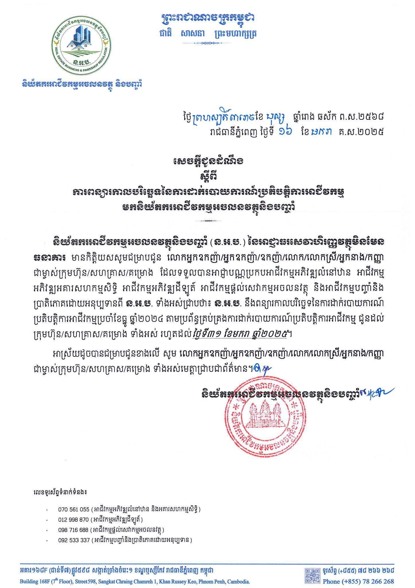 និយ័តករអាជីវកម្មអចលនវត្ថុ និងបញ្ចាំ នាថ្ងៃទី១៦ ខែមករា ឆ្នាំ២០២៥ នេះ បានចេញសេចក្ដីជូនដំណឹង ស្ដីពីការពន្យារកាលបរិច្ឆេទនៃការដាក់របាយការណ៍ប្រតិបត្តិការអាជីវកម្មមកនិយ័តករអាជីវកម្មអចលនវត្ថុនិងបញ្ចាំ។