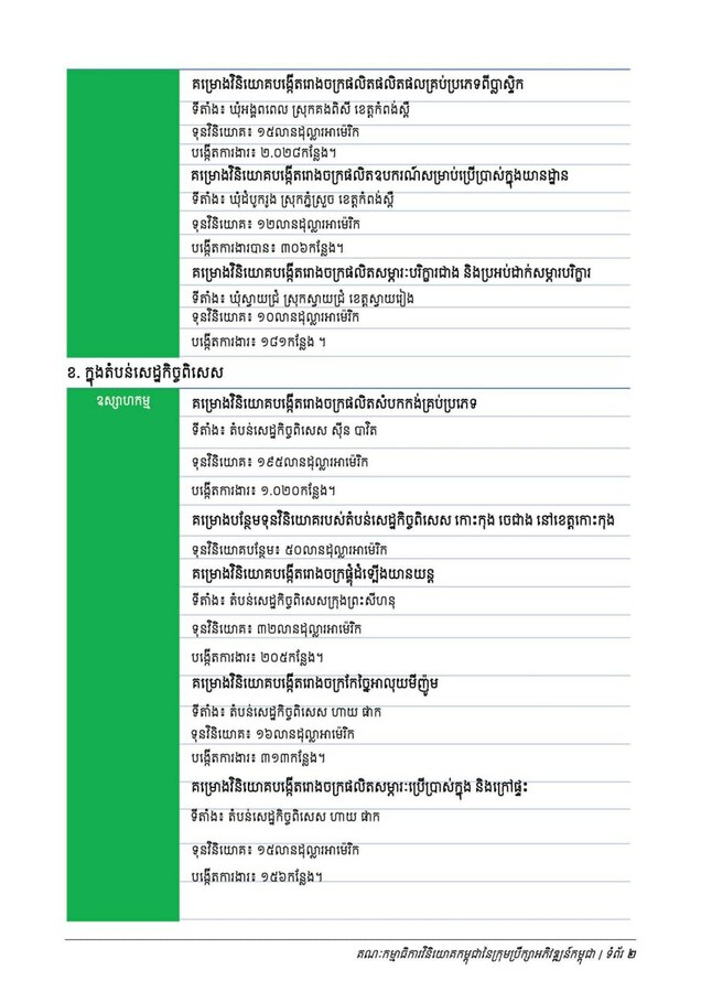 ក្នុង​ចំណោម​គម្រោង​វិនិយោគទាំង​៦៨គម្រោង​​ សុទ្ធសឹងតែជា​គម្រោ​ង​​ក្នុងវិស័យឧស្សាហកម្ម​ ។ក្នុងនោះខេត្ត​កំពង់ស្ពឺ​ទទួលបានគម្រោង​វិនិយោគ​ច្រើនជាង​គេ​ ដែល​មានរហូតដល់១៩​គម្រោង​ ។បន្ទាប់មក​ខេត្ត​ស្វាយរៀង ចំនួន​១៣​គម្រោង ,ភ្នំពេញ​១០​គម្រោង ​ ,ព្រះសីហនុ​៩គម្រោង ,កោះកុង​៨​គម្រោង ,តាកែវ ៤គម្រោង និងខេត្ត​មួយចំនួន​ទៀត​ទទួលបាន​គម្រោង​វិនិយោគតែ១​គម្រោងៗប៉ុណ្ណោះ ។