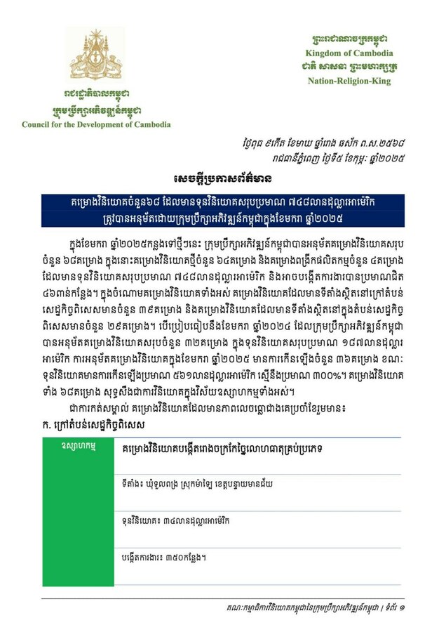 គួររំលឹកថា កាលពី​ឆ្នាំ២០២៤កន្លងទៅ​ ក្រុម​ប្រឹក្សា​អ​ភិវ​​ឌ្ឍន៍​បានចុះបញ្ជី​គម្រោង​វិនិយោគ​សរុប​ជាង​៤០០​គម្រោង​ជាមួយនឹងទុនវិនិយោគ​ជិ​ត​​៧ពាន់លានដុល្លារ​ ដែល​ជា​ទុនវិនិយោគ​ច្រើន​មិនធ្លាប់​មាន​កន្លងមក ។នេះគឺជាសញ្ញា​វិជ្ជ​មាន​​មួ​យ​ស​ម្រាប់​កម្ពុជា​ទទួលបានការ​វិនិយោគពី​ក្រៅ​ និងក្នុង​ប្រទេស៕