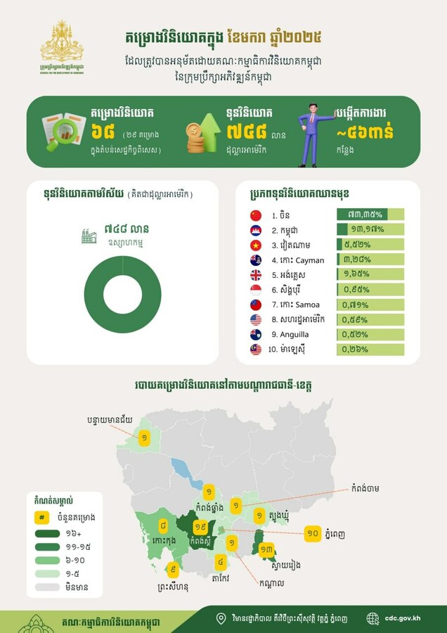យោងតាមការចុះផ្សាយរបស់ ក្រសួងព័ត៌មាន បានឱ្យដឹងថា នៅខែមករាឆ្នាំ២០២៥​ ប្រទេសចិន​នៅតែឈរ​លំដាប់ទី​១ ជាវិនិយោគិន​​បណ្ដាក់ទុនវិនិយោគ​ច្រើនជាង​គេនៅកម្ពុជា។ ​ក្នុងខែមករាកន្លងទៅថ្មីៗ​នេះ កម្ពុជា​ទទួលបានទុនវិនិយោគ​​សរុប​ ៧៤៨​លាន​ដុល្លា​រអាមេរិក ក្នុ​ងនោះ​មានប្រភពទុន​វិនិយោគពី​ប្រទេស​ចិនប្រមាណ ៧៣,៣៥​ភាគរយ​ ឬប្រមាណ ​៥៤៨​លាន​ដុល្លារ ។