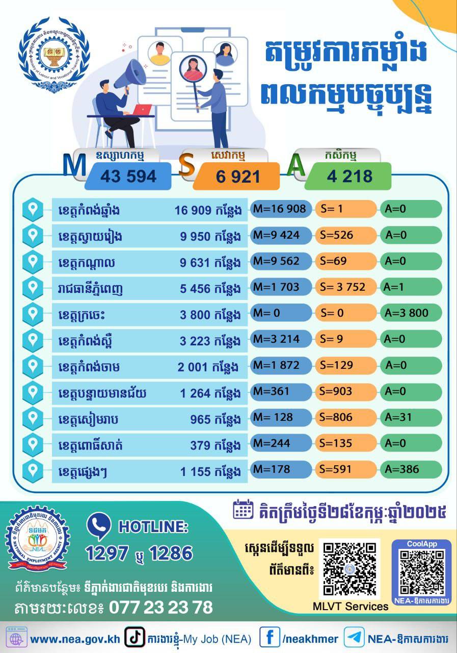 យោងតាមការចុះផ្សាយរបស់ ក្រសួងការងារ និងបណ្ដុះបណ្ដាលវិជ្ជាជីវៈ បានឱ្យដឹងថា គិតត្រឹមថ្ងៃទី ២៨ ខែ កុម្ភៈ ឆ្នាំ២០២៥នេះ តម្រូវការកម្លាំងពលកម្មមានចំនួន ៥៤ ៧៣៣ កន្លែង នៅតាមបណ្ដារាជធានី-ខេត្ត ក្នុងនោះផ្នែកឧស្សាហកម្មមានចំនួន ៤៣៥៩៤ កន្លែង ផ្នែកសេវាកម្មចំនួន ៦៩២១កន្លែង និងផ្នែកកសិកម្មចំនួន ៤២១៨កន្លែង។