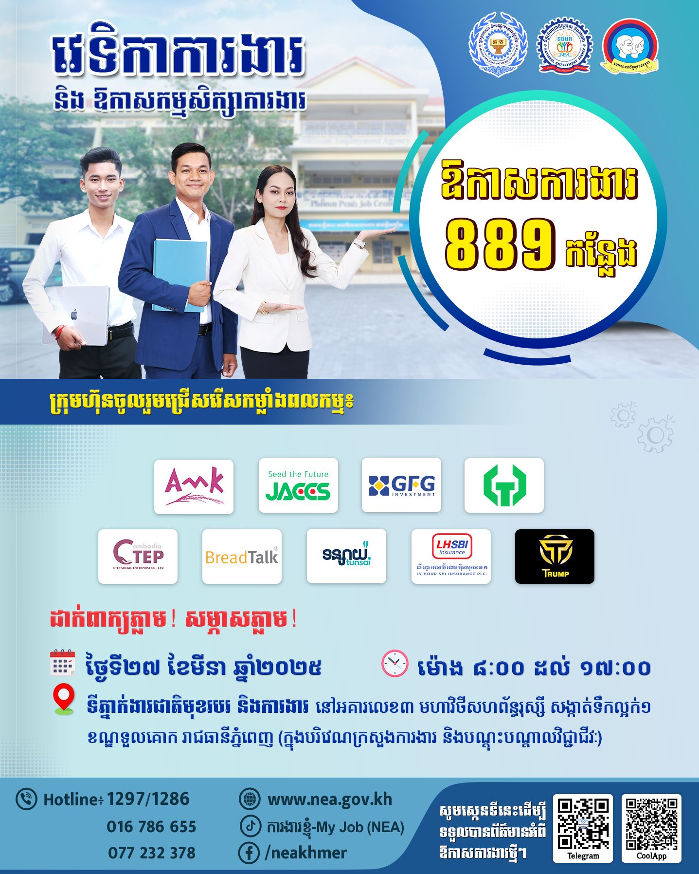 ឱកាសការងារថ្មីរាប់រយកន្លែងខាងលើនេះ នឹងត្រូវផ្ដល់នៅក្នុងវេទិកាការងាររបស់ NEA នាថ្ងៃព្រហស្បតិ៍ ទី២៧ ខែមីនា ឆ្នាំ២០២៥ ខាងមុខនេះ ចាប់ពីម៉ោង ៨ព្រឹក ដល់ ៥ ល្ងាច នៅក្នុងបរិវេណក្រសួងការងារ និងបណ្តុះបណ្តាលវិជ្ជាជីវៈ។