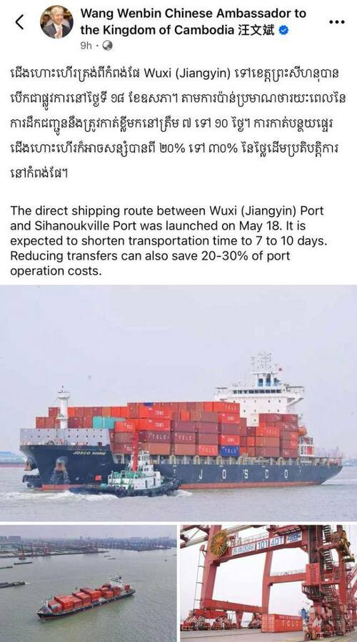 យោងតាមការចុះផ្សាយរបស់ ក្រសួងព័ត៌មាន បានឱ្យដឹងថា ផ្លូវដឹកជញ្ជូនត្រង់ថ្មីមួយដែលភ្ជាប់កំពង់ផែ Wuxi របស់ចិន ជាមួយកំពង់ផែក្រុងព្រះសីហនុ ត្រូវបានដាក់ឱ្យដំណើរការកាលពីថ្ងៃទី១៨ ខែឧសភា ឆ្នាំ២០២៥ ដោយរំពឹងថានឹងកាត់បន្ថយពេលវេលា និងការចំណាយប្រតិបត្តិការយ៉ាងច្រើន។ នេះបើយោងតាមការលើកឡើងរបស់ឯកឧត្តម វ៉ាង វិនពីន (WANG Wenbin) ឯកអគ្គរដ្ឋទូតចិនប្រចាំកម្ពុជា នៅលើបណ្ដាញសង្គមហ្វេសប៊ុកនៅព្រឹកថ្ងៃទី២១ ខែឧសភា។