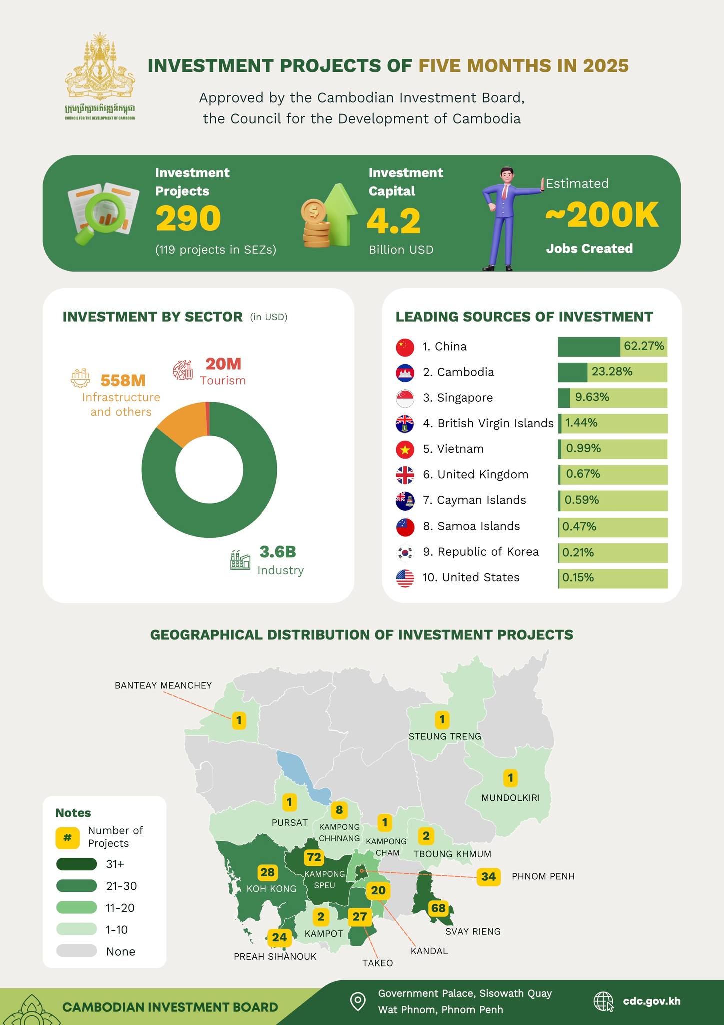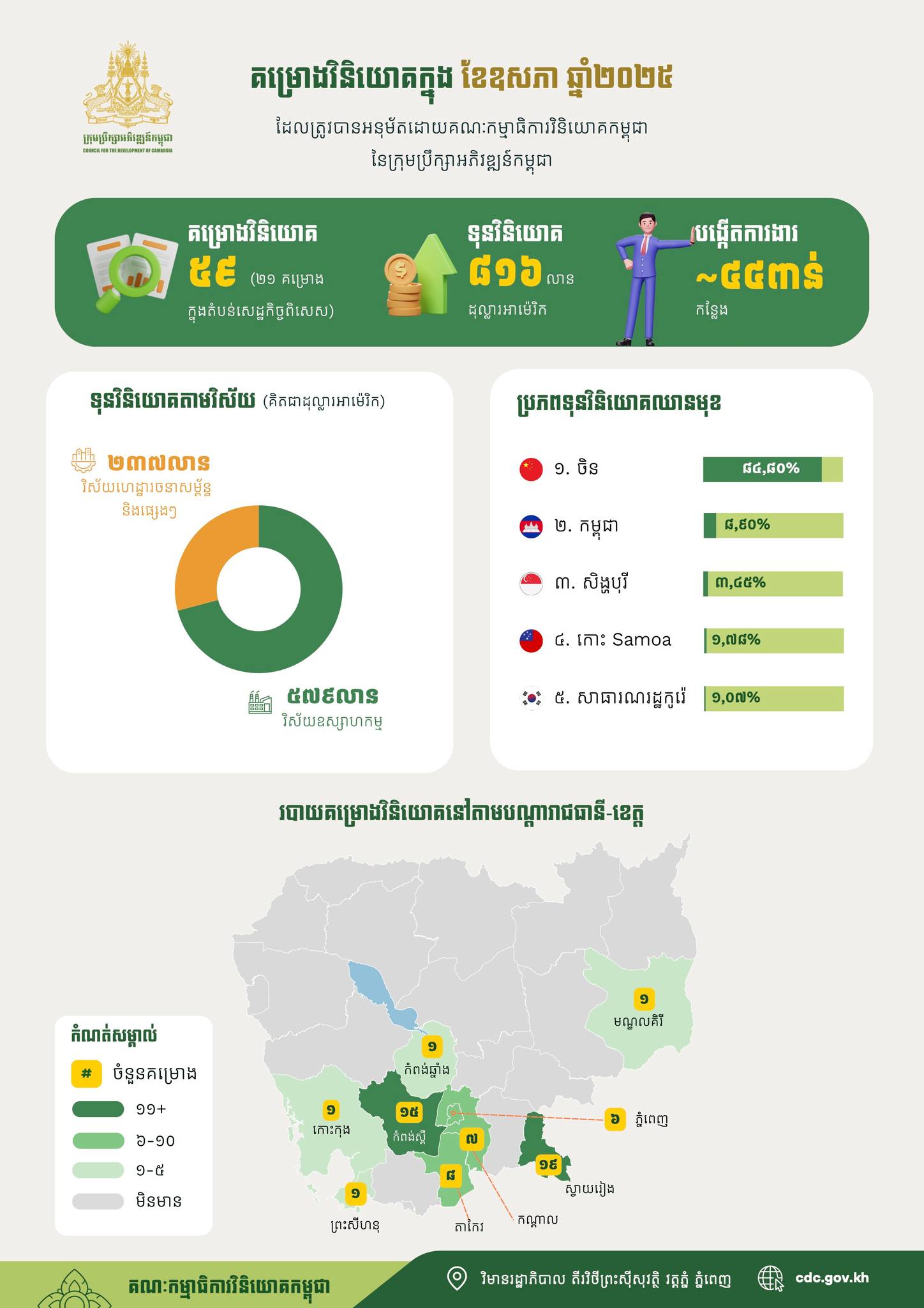 ក្នុងខែឧសភា ឆ្នាំ២០២៥ គម្រោងវិនិយោគចំនួន ៥៩ ដែលមានទុនវិនិយោគសរុបប្រមាណ ៨១៦លានដុល្លារអាមេរិក ត្រូវបានចុះបញ្ជីដោយក្រុមប្រឹក្សាអភិវឌ្ឍន៍កម្ពុជា