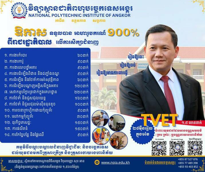 (ភ្នំពេញ)៖ វិទ្យាស្ថានជាតិពហុបច្ចេកទេសអង្គរ នៃក្រសួងការងារ និងបណ្តុះបណ្តាលវិជ្ជាជីវៈ ផ្តល់អាហារូបករណ៍ចំនួន ១ ៥០០កន្លែង លើ ១៤មុខជំនាញ ដល់យុវជនមកពីគ្រួសារក្រីក្រ និងគ្រួសារងាយរងហានិភ័យ ព្រមទាំងផ្ដល់ប្រាក់ឧបត្ថម្ភប្រចាំខែ ក្រោមកម្មវិធីបណ្តុះបណ្តាលជំនាញវិជ្ជាជីវៈ និងបច្ចេកទេសដល់យុវជនមកពីគ្រួសារក្រីក្រ និងគ្រួសារងាយរងហានិភ័យ (TVET 1.5M)។ សម្រាប់ប្រជាពលរដ្ឋ និងយុវជន ដែលមិនមែនជាក្រុមគោលដៅ ក៏អាចស្នើចុះឈ្មោះចូលសិក្សាបានដោយឥតគិតថ្លៃផងដែរ ប៉ុន្តែមិនទទួលបានប្រាក់ឧបត្ថម្ភនោះឡើយ។