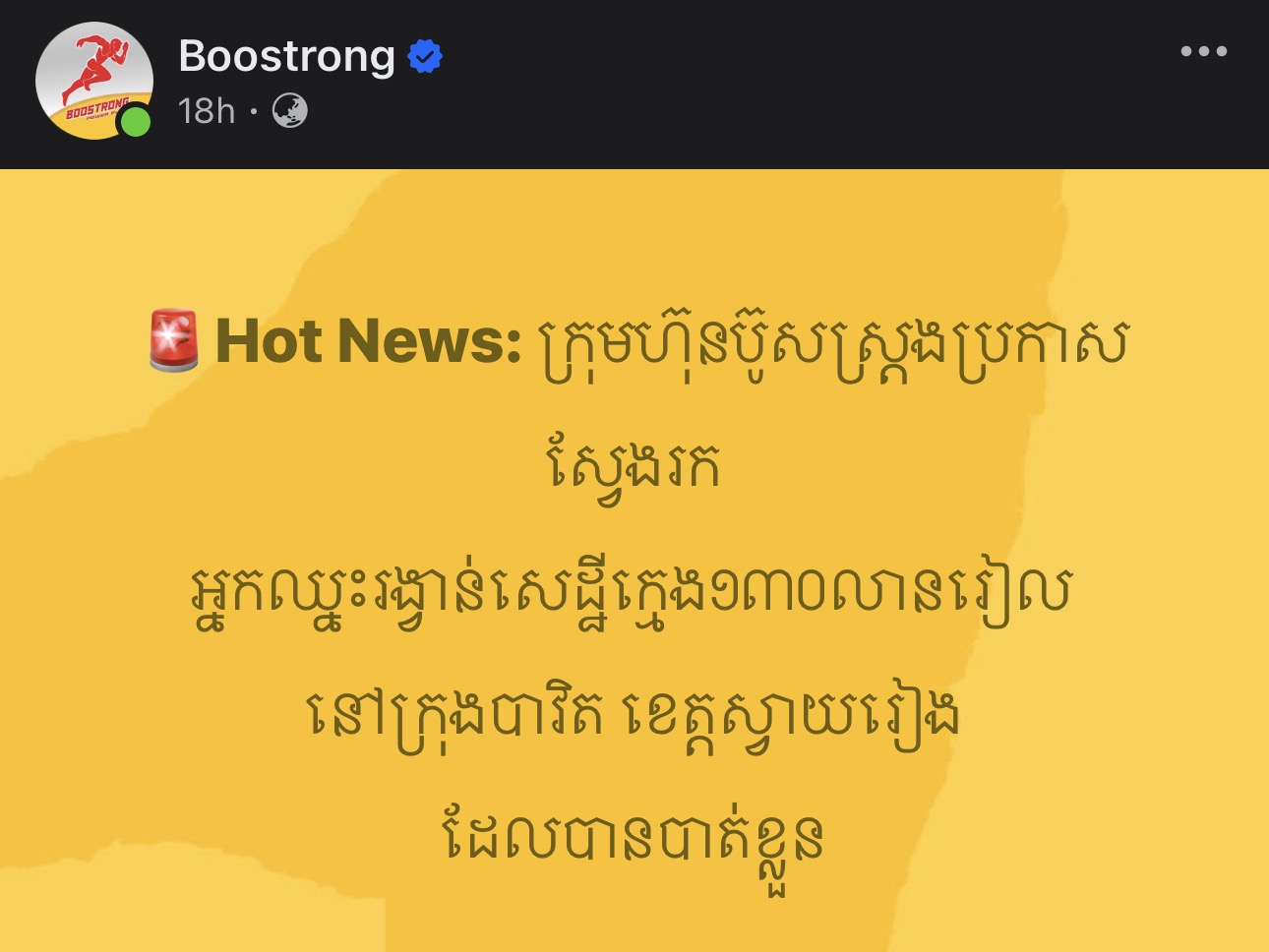 ដូច្នេះបងប្អូនជួយស៊ែឱ្យគាត់បានដឹងផង ដើម្បីឱ្យក្រុមហ៊ុនប៊ូសស្រ្តងបានចុះទៅពិនិត្យក្រវិល ថាពិតជាត្រូវរង្វាន់ 130លានមែន ឬយ៉ាងណា។ ហើយក៏សូមផ្ដាំទៅអ្នកលក់ប៊ូសស្រ្តងជុំវិញក្រុងបាវិតទាំងអស់ បើបានទទួលដំណឹងពីអ្នកឈ្នះ 130លាននេះហើយ សូមទាក់ទងមកក្រុមហ៊ុន ព្រោះអ្នកលក់ 30នាក់នៅជិតនោះ នឹងទទួលបានម្នាក់ 1លានរៀលផងដែរ៕