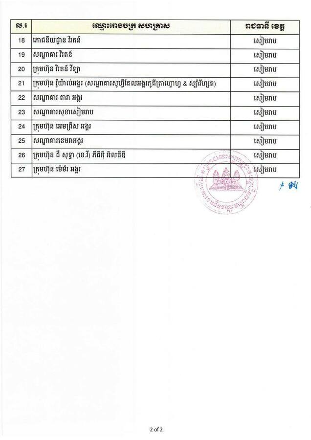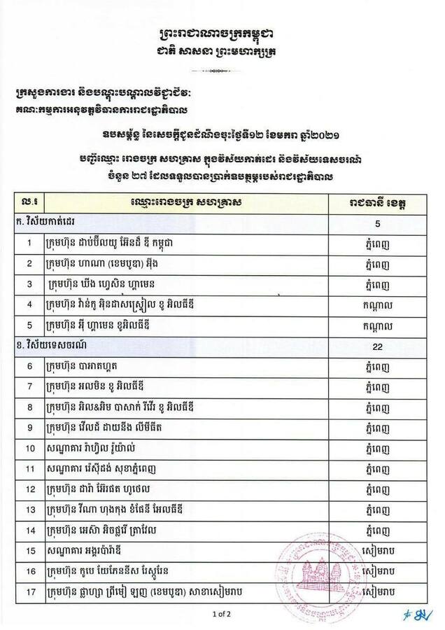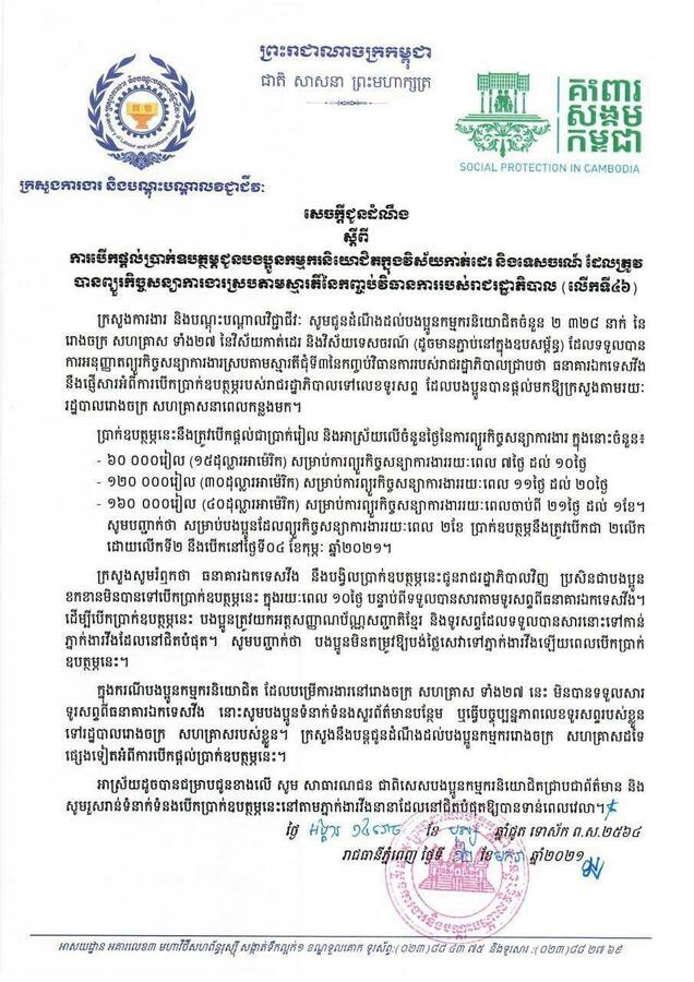 កម្មករនិយោជិតចំនួន ២,៣២៨ នាក់ នៃរោងចក្រ សហគ្រាសទាំង២៧ ក្នុងវិស័យកាត់ដេរ និងវិស័យទេសចរណ៍ ដែលទទួលបានការអនុញ្ញាតព្យួរកិច្ចសន្យាការងារស្រប តាមស្មារតីជុំទី៣នៃកញ្ចប់វិធានការរបស់រាជរដ្ឋាភិបាល នឹងបន្តទទួលបានប្រាក់ឧបត្ថម្ភលើកទី៤៦ ហើយធនាគារ ឯកទេសវីងនឹងផ្ញើសារអំពីការបើកប្រាក់ឧបត្ថម្ភរបស់រាជរដ្ឋាភិបាលទៅលេខទូរសព្ទដែលបងប្អូនបានផ្តល់មកឱ្យក្រសួង តាមរយៈរដ្ឋបាលរោងចក្រ សហគ្រាសនាពេលកន្លងមក។