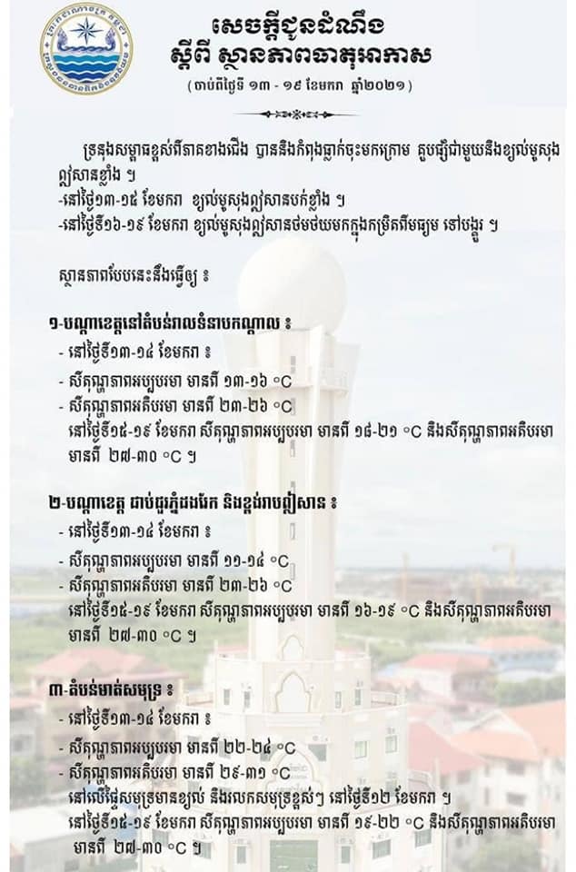សមាគមវារីវប្បករនៅកម្ពុជា កាលពីពេលថ្មីៗនេះ បានបង្ហោះនៅលើផេកផ្លូវការរបស់ខ្លួន ស្ដីពីសារបន្ទាន់សម្រាប់បងប្អូនវារីវប្បករកម្ពុជា ក្នុងការថែរក្សាត្រីចិញ្ចឹម ដែលចេញដោយដោយក្រុមបច្ចេកទេសគម្រោងខាស់ CAST ខណៈដែលអាកាសធាតុចុះត្រជាក់។ យោងតាមសារដែលបានបង្ហោះបានរៀបរាប់ដូច្នេះថា៖ « រយៈមួយសប្តាហ៍ខាងមុខនេះ អាកាសធាតុចុះត្រជាក់ខ្លាំង ហើយនៅពេលស៊ីតុណ្ហភាពចុះត្រជាក់ វាអាចបណ្តាលអោយត្រីចិញ្ចឹមមានសភាពខុសប្រក្រតី ដែលធ្វេីអោយភាពស៊ាំធ្លាក់ចុះ និងមិនសូវស៊ីចំណី ហេីយក៏ងាយរងនូវការវាយប្រហារពីមេរោគផ្សេងៗទៀត។ ប្រសិនបេីលោកអ្នកសង្កេតឃេីញថា ត្រីមិនសូវសកម្ម ដំបូងត្រូវកាត់បន្ថយ ឬផ្អាកការអោយចំណីបណ្ដោះអាសន្ន និងបង្កើនអោយមានអុកស៊ីសែនក្នុងទឹក តាមរយៈការធ្វើទឹកអោយមានចលនាដូចជាប្រើម៉ាស៊ីនវ៉ៃទឹក ឬប្រើម៉ូទ័របូមទឹកឡើងលើ ជាដើម »។