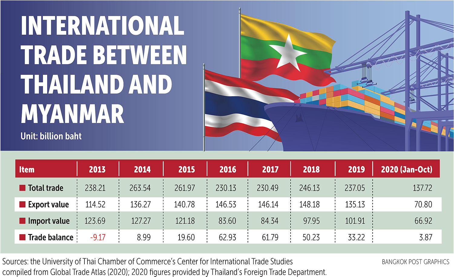 ប្រទេសថៃ ត្រូវបានប៉ាន់ប្រមាណថានឹងខាតបង់ប្រាក់ចំនួន ៥០លានបាត (ជាង ១.៦ លានដុល្លារ) ក្នុងមួយថ្ងៃពីការធ្វើពាណិជ្ជកម្មតាមព្រំដែន ដោយសារការដឹកជញ្ជូនទំនិញមិនមានភាពងាយស្រួល និងការត្រួតពិនិត្យសន្តិសុខយ៉ាងតឹងរឹងដោយរដ្ឋបាលយោធាមីយ៉ាន់ម៉ា។ យោងតាមនាយកមជ្ឈមណ្ឌលសិក្សាពាណិជ្ជកម្មអន្តរជាតិនៅសាកលវិទ្យាល័យសភាពាណិជ្ជកម្មថៃលោក Aat Pisanwanich បានឲ្យដឹងថា ផលប៉ះពាល់អាចនឹងមានដល់ជាង ១.៥ ទៅ ២ ពាន់លានបាតក្នុងមួយខែ ប្រសិនបើការត្រួតពិនិត្យសន្តិសុខនៅតែបន្តរឹតបន្តឹង។
