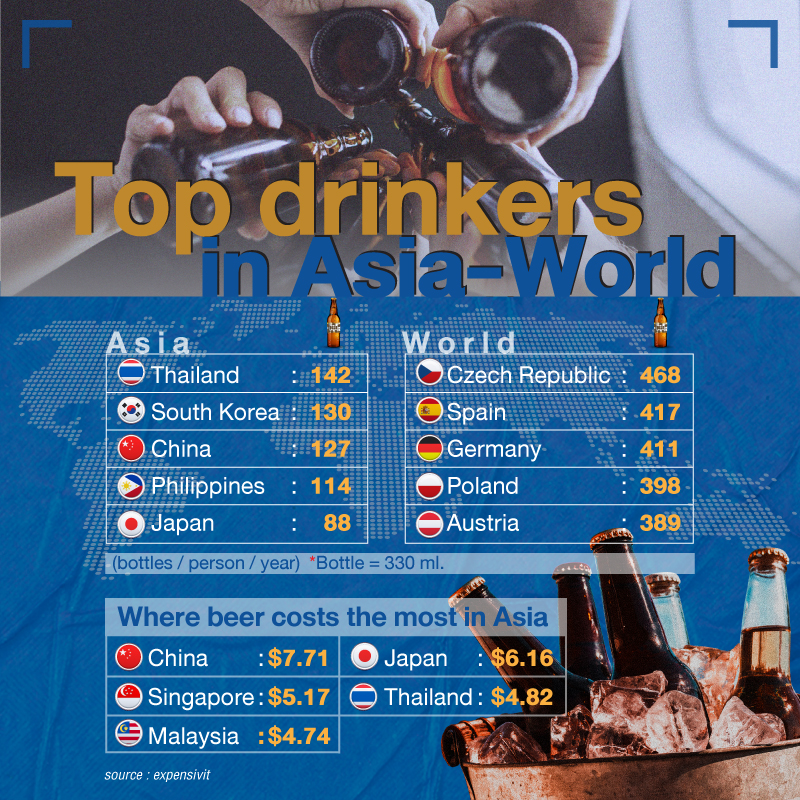 យោងតាមការស្ទង់មតិថ្មីៗនេះបានរកឃើញថា ជនជាតិថៃ គឺជាអ្នកផឹកស្រាបៀរច្រើនជាងគេនៅអាស៊ី ខណៈដែលប្រទេសឆេក ឈរនៅលើគេក្នុងពិភពលោក។ ជាមួយគ្នានេះដែរ បើយោងតាមសន្ទស្សន៍ស្រាបៀរពិភពលោកប្រចាំឆ្នាំនេះ ដែលត្រូវបានផ្សព្វផ្សាយនៅលើគេហទំព័រ expensivity.com ប្រជាជនថៃទទួលទានស្រាបៀរជាមធ្យមចំនួន ១៤២ដបក្នុងម្នាក់ក្នុងមួយឆ្នាំ បន្ទាប់មកជនជាតិកូរ៉េដែលទទួលទាន ១៣០ដបក្នុងម្នាក់។