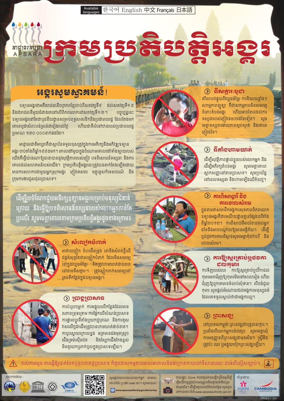 លោក ឡុង កុសល អ្នកនាំពាក្យនៃអាជ្ញាធរជាតិអប្សរា បានមានប្រសាសន៍ថា អាជ្ញាធរជាតិអប្សរា ជាស្ថាប័នទទួលខុសត្រូវក្នុងការអភិរក្ស និងអភិវឌ្ឍតំបន់រមណីយដ្ឋានអង្គរ ហើយកន្លងមកបានសហការជាមួយអ្នកស្រុកក្នុងតំបន់អង្គរ , ភ្ញៀវទេសចរ , មគ្គុទ្ទេសក៍ទេសចរណ៍ និងក្រុមការងារជួសជុលប្រាសាទជាដើម បានបង្កើតក្រមមួយឈ្មោះថា ក្រមប្រតិបត្តិអង្គរ ដែលមានខ្លឹមសារសំខាន់ៗ គឺ ៖ ហាមស្លៀកមិនសមរម្យខើចលើខើចក្រោម , ហាមប៉ះក្បាច់ចម្លាក់ ឬអង្គុយលើថ្មទ្រុឌទ្រោម , ហាមស្រែកឡូឡា , ហាមឡើងលើគំនរថ្ម , ត្រូវគោរពស្លាកសញ្ញា , ហាមជក់បារី និងចោលសំរាមជាដើម។ ក្នុងគោលបំណងសំខាន់ ដើម្បីឱ្យភ្ញៀវទេសចរដែលមកទស្សនារមណីយដ្ឋានអង្គរវត្តនេះ បានសម្ដែងនូវការគោរព និង លើកតម្លៃ នូវស្នាដៃបុព្វបុរសខ្មែរ ដែលបានកសាងបន្សល់ទុករហូតមកដល់បច្ចុប្បន្ន រួមទាំងធ្វើឲ្យមានរបៀបរៀបរយសម្រាប់តំបន់មណីយដ្ឋានអង្គរ ពិសេសគឺការរួមចំណែកក្នុងការអភិរក្ស និងលើកតម្លៃតំបន់រមណីយដ្ឋានអង្គរ ។