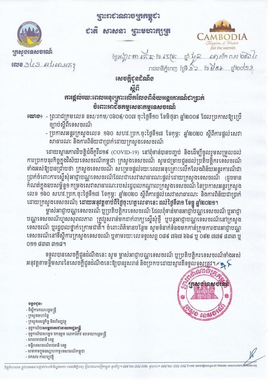 ដោយសារស្ថានភាពវិបត្តិជំងឺកូវីដ១៩ នៅពុំទាន់បានបញ្ចប់ និងដើម្បីចូលរួមសម្រួលដល់ការប្រកបអាជីវកម្មសេវាកម្មទេសចរណ៍ដែលកំពុងរងផលប៉ះពាល់ខ្លាំងផងនោះ ក្រសួងទេសចរណ៍បានសម្រេចផ្ដល់រយៈពេលអនុគ្រោះលើកលែងការពិន័យអន្តរការណ៍ជាប្រាក់ ចំពោះការស្នើសុំអាជ្ញាបណ្ណទេសចរណ៍ ចាប់ពីថ្ងៃទី១៦ ខែមីនា រហូតដល់ថ្ងៃទី៣១ ខែធ្នូ ឆ្នាំ២០២១ ខាងមុខ។