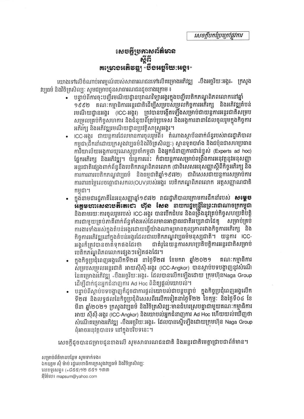 នៅក្នុងសេចក្ដីប្រកាសព័ត៌មានបានរៀបរាប់ដូច្នេះថា ក្នុងកិច្ចប្រជុំពេញអង្គ លើកទី២៧ នាថ្ងៃទី២៧ ខែមករា ឆ្នាំ២០២១ គណៈកម្មាធិការសម្របសម្រួលអន្តរជាតិ អាយស៊ីស៊ី-អង្គរ (ICC-Angkor) បានស្ដាប់បទបង្ហាញ នូវសំណើនៃម្រោងអភិវឌ្ឍន៍ “បឹងអច្ឆរិយៈអង្គរ” ដែលបានលើកឡើងដោយក្រុមហ៊ុន Naga Group ដើម្បីដាក់ជូនអ្នកជំនាញការ Ad Hoc ពិនិត្យយោបល់។ បន្ទាប់ពីស្ដាប់បទបង្ហាញ ក៏ដូចជាការផ្ដល់យោបល់ជាបន្តបន្ទាប់ ក្នុងកិច្ចប្រជុំពេញអង្គលើកទី២៧ និងលទ្ធផលនៃកិច្ចប្រជុំពិសេសពីរលើកទៀតនាថ្ងៃទី២២ ខែកុម្ភៈ និងថ្ងៃទី០៤ ខែមីនា ឆ្នាំ២០២១ ក្រសួងវប្បធម៌ និងវិចិត្រសិល្បៈមានជំហរស្របគ្នាជាមួយគណៈកម្មាធិការអាយស៊ីស៊ី-អង្គរ និងយោបល់ពីអ្នកជំនាញ Ad Hoc ហើយយល់ឃើញថា គម្រោងអភិវឌ្ឍន៍ “បឹងអច្ឆរិយៈអង្គរ” ដែលស្នើដោយក្រុមហ៊ុនណាហ្គា ពុំអាចអនុវត្តបានទេ នៅក្នុងបរិបទនេះ។