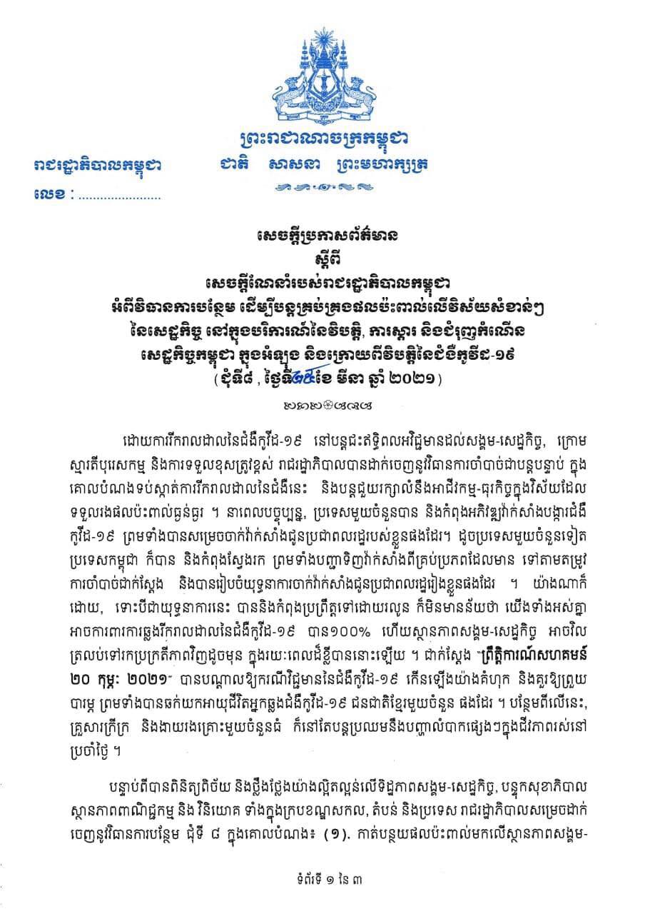 យោងតាម​ការចុះផ្សាយរបស់ក្រសួងទេសចរណ៍បានឲ្យដឹងថា រាជរដ្ឋាភិបាលកម្ពុជា នៅថ្ងៃទី២៥ ខែមីនា ឆ្នាំ២០២១នេះ បានសម្រេចដាក់ចេញវិធានការបន្ថែម បន្តគ្រប់គ្រងផលប៉ះពាល់លើវិស័យសំខាន់ៗ ដើម្បីស្ដារ និងជំរុញកំណើនសេដ្ឋកិច្ចកម្ពុជា ពីវិបត្តិនៃជំងឺកូវីដ១៩ (ជុំទី៨)។ ការដាក់ចេញវិធានការបន្ថែមនេះ រាជរដ្ឋាភិបាល បានសម្រេចបន្តជួយឧបត្ថម្ភ ដល់កម្មករក្នុងវិស័យកាត់ដេរ វាយនភណ្ឌ, ស្បែកជើង, ផលិតផលធ្វើដំណើរ, កាបូប និងវិស័យទេសចរណ៍ និងវិស័យទេសចរណ៍ រយៈពេល៣ខែថែមទៀត ចាប់ពីខែមេសា ដល់ ខែមិថុនា ឆ្នាំ២០២១។ ជាមួយគ្នានេះ ការលើកទឹកចិត្តផ្នែកពន្ធដារ ក៏នៅតែបន្តអនុវត្តន៍ផងដែរ។