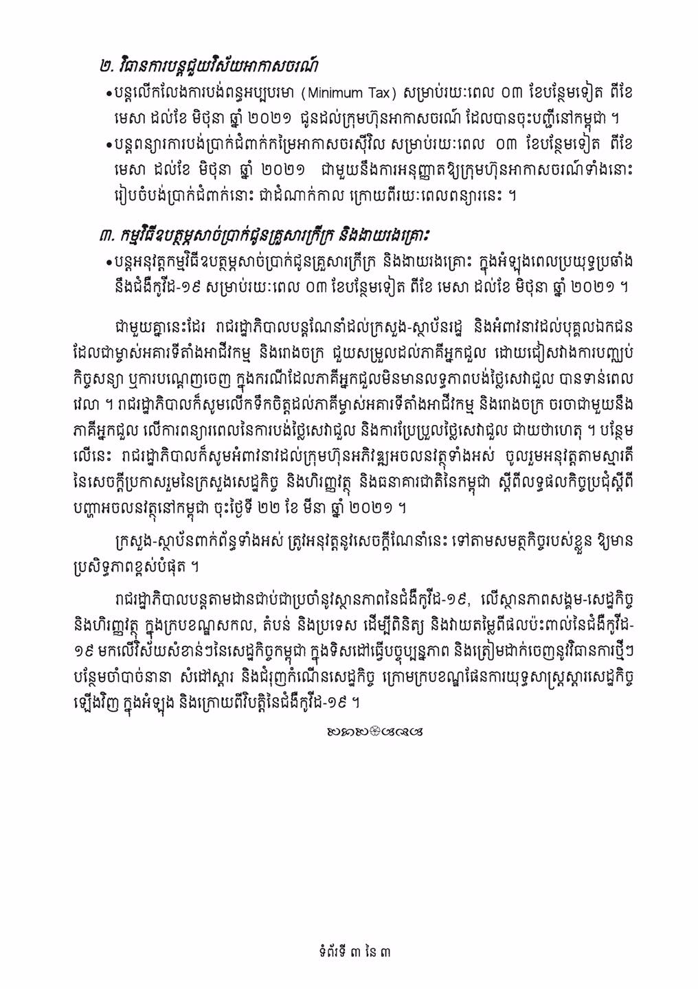 * បន្តលើកលែងការបង់ពន្ធប្រចាំខែគ្រប់ប្រភេទ ចំពោះសណ្ឋាគារ, ផ្ទះសំណាក់, ភោជនីយដ្ឋាន និង ក្រុមហ៊ុនភ្នាក់ងារទេសចរណ៍ ដែលបានចុះបញ្ជីជាមួយអគ្គនាយកដ្ឋានពន្ធដារ និងមានសកម្មភាពអាជីវកម្ម នៅក្នុងរាជធានីភ្នំពេញ, ខេត្តសៀមរាប, ខេត្តព្រះសីហនុ, ខេត្តកែប, ខេត្តកំពត, ក្រុងបាវិត និងក្រុងប៉ោយប៉ែត សម្រាប់រយៈពេល ០៣ ខែបន្ថែមទៀត ពីខែ មេសា ដល់ខែ មិថុនា ឆ្នាំ ២០២១ ។ អាជីវកម្មទាំងនេះ នៅតែមានកាតព្វកិច្ចដាក់លិខិតប្រកាសពន្ធអាករ និងប្រើប្រាស់ប្រព័ន្ធអនឡាញ សម្រាប់គ្រប់គ្រងអាករលើតម្លៃបន្ថែម (E-VAT) ជារៀងរាល់ខែ ក្នុងអំឡុងពេលនៃការលើកលែងនេះ ។