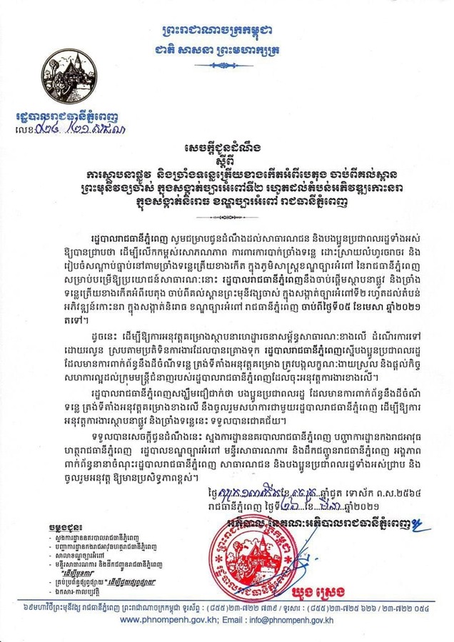 បន្ថែមពីនេះ ស្នងការដ្ឋាននគរបាលរាជធានីភ្នំពេញ បញ្ជាការដ្ឋានកងរាជអាវុធហត្ថរាជធានីភ្នំពេញ រដ្ឋបាលខណ្ឌច្បារអំពៅ មន្ទីរសាធារណការ និងដឹកជញ្ជូនរាជធានីភ្នំពេញ អង្គភាពពាក់ព័ន្ធនានាចំណុះរដ្ឋបាលរាជធានីភ្នំពេញ សាធារណជន និងបងប្អូនប្រជាពលរដ្ឋទាំងអស់ជ្រាប និងចូលរួមអនុវត្ត ឱ្យមានប្រសិទ្ធភាពខ្ពស់៕