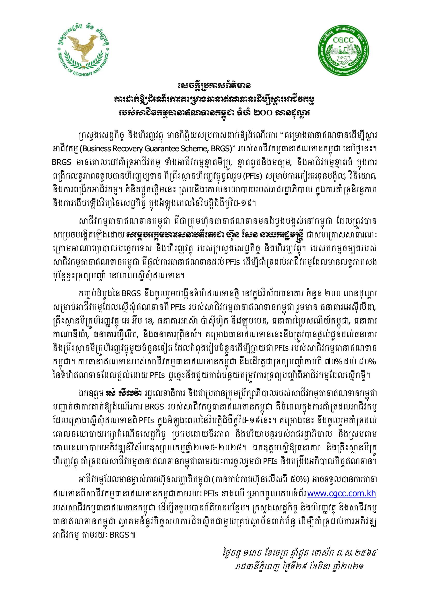ក្រសួងសេដ្ឋកិច្ច និងហិរញ្ញវត្ថុ នៅថ្ងៃច័ន្ទ ទី២៩ ខែមីនា ឆ្នាំ២០២១នេះ បានប្រកាសដាក់ឱ្យដំណើរការ «គម្រោងធានាឥណទាន ដើម្បីស្តារអាជីវកម្ម » របស់សាជីវកម្មធានាឥណទានកម្ពុជាទំហំ ២០០លានដុល្លារ។ បើតាមសេចក្តីប្រកាសព័ត៌មានរបស់ក្រសួងសេដ្ឋកិច្ច និងហិរញ្ញវត្ថុ គម្រោងធានាឥណទាន ដើម្បីស្តារអាជីវកម្ម មានគោលដៅគាំទ្រអាជីវកម្ម ទាំងអាជីវកម្មខ្នាតមីក្រូ, ខ្នាតតូចនិងមធ្យម, និងអាជីវកម្មខ្នាតធំ ក្នុងការពង្រីកលទ្ធភាពទទួលបានហិរញ្ញប្បទាន ពីគ្រឹះស្ថានហិរញ្ញវត្ថុចូលរួម សម្រាប់ការកៀរគរទុនបង្វិល, វិនិយោគ, និងការពង្រីកអាជីវកម្ម។