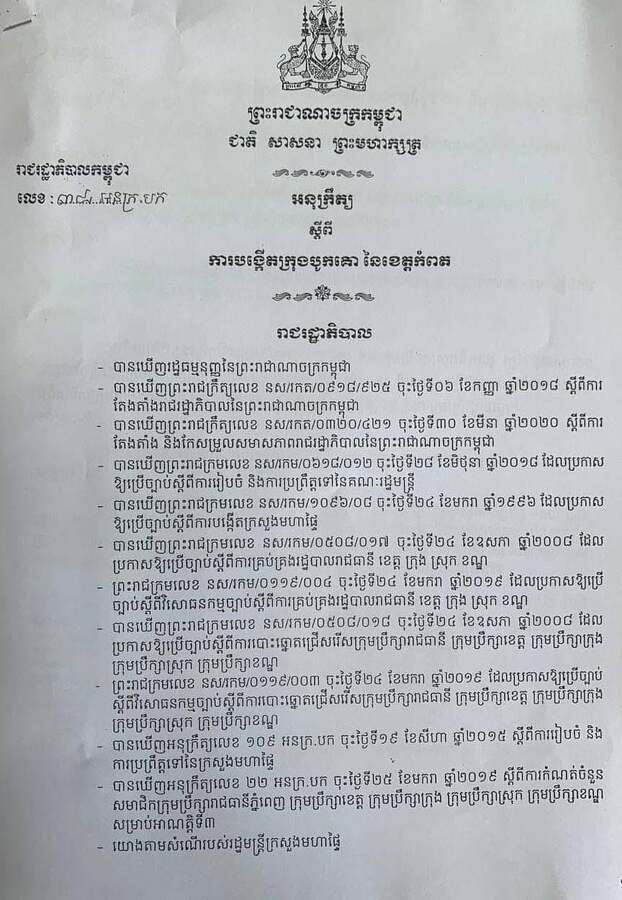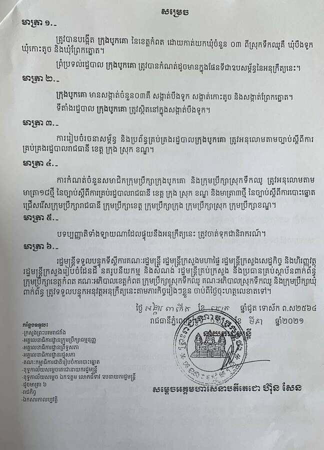 សម្តេចតេជោ ហ៊ុន សែន នាយករដ្ឋមន្ត្រី ចេញអនុក្រឹត្យបង្កើតក្រុងបូកគោ នៃខេត្តកំពត ដោយកាត់យកឃុំចំនួន៣ ពីស្រុកទឹកឈូ