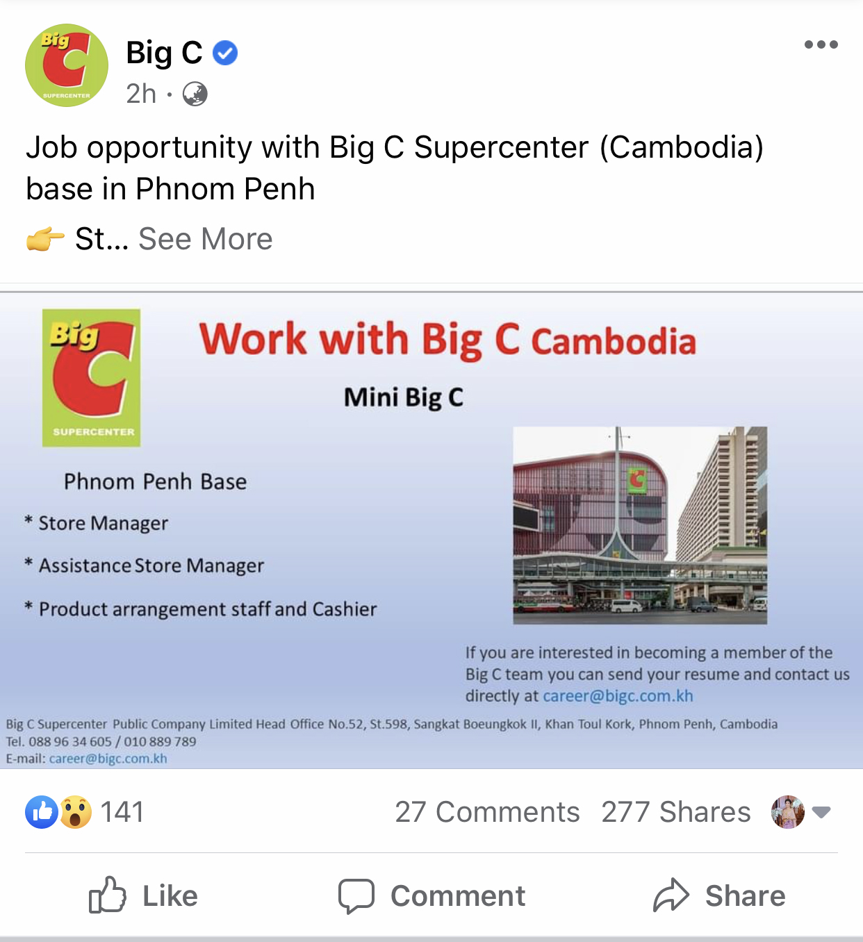 នៅលើហ្វេសប៊ុកផេករបស់ផ្សារទំនើបមួយនេះបានបង្ហាញទៀតថា Big C កំពុងត្រូវការបុគ្គលិកចូលបម្រើការងារនៅក្នុងសាខារបស់ខ្លួននៅទីក្រុងភ្នំពេញ សម្រាប់មុខដំណែងដូចជា អ្នកគ្រប់គ្រង (Store Manager) ជំនួយការអ្នកគ្រប់គ្រង ( Assistant Store Manager) បុគ្គលិកផ្នែកស្តុក (Product Arrangement staff) និង បុគ្គលិកផ្នែកគិតលុយ (Cashier)។